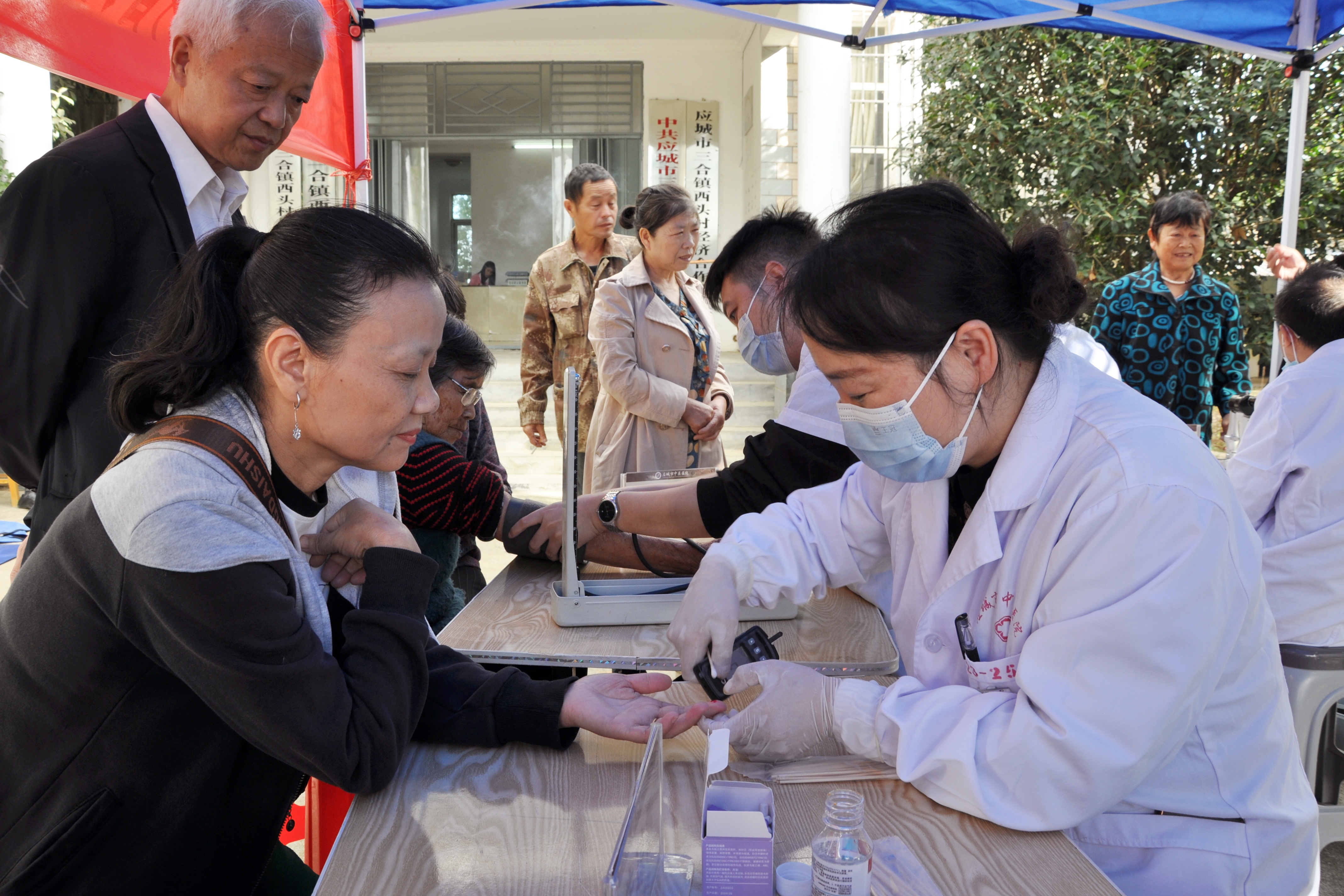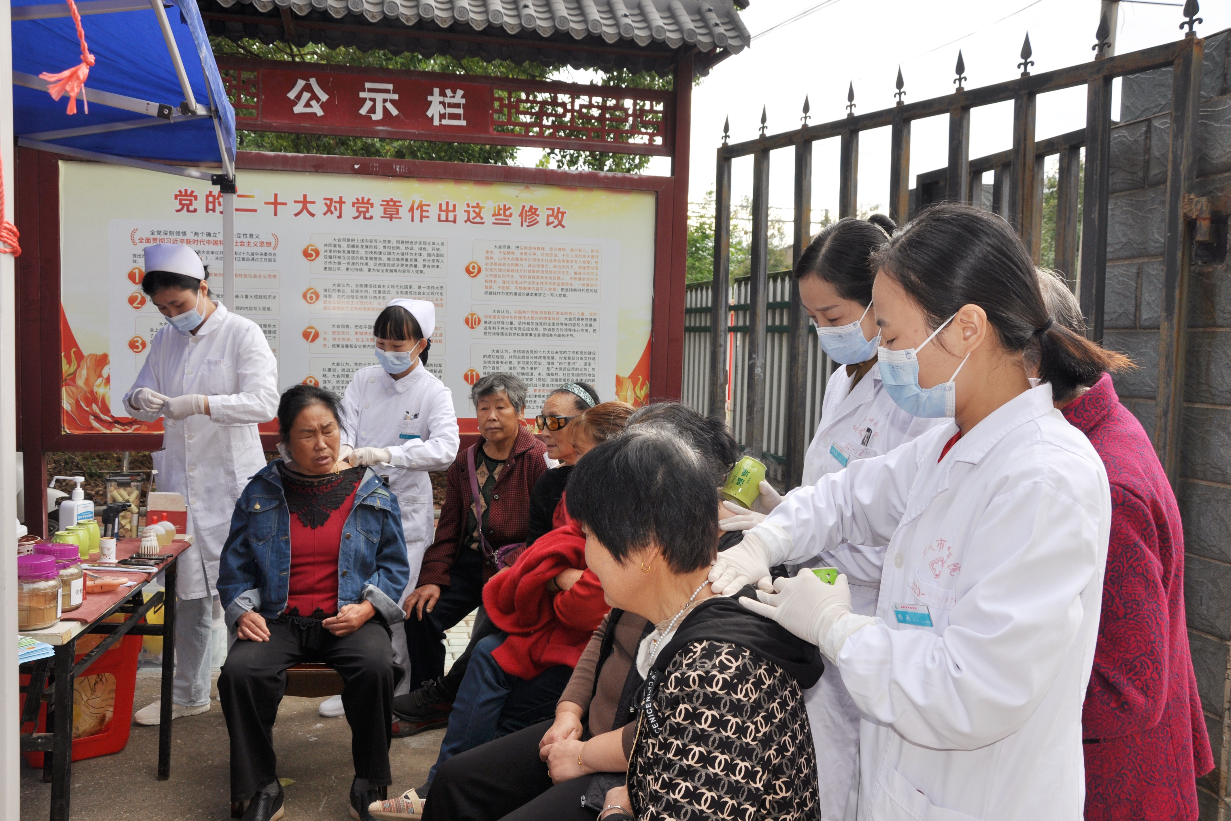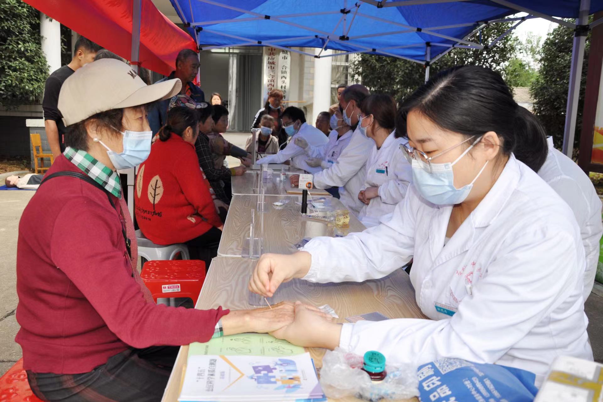 义诊现场,来自该院的医疗专家团队免费为村民量血压、测血糖,提供内科、外科、眼科、口腔等健康问诊,耐心解答健康疑问,并根据个人健康状况给出个性化健康指导。康复科专家针对常见的肩颈腰腿痛等症状,现场为有需要的村民进行针灸治疗,提供康复指导;护理人员运用艾灸、刮痧等中医适宜技术,让村民近距离感受中医药的特色与疗效。