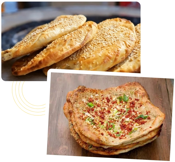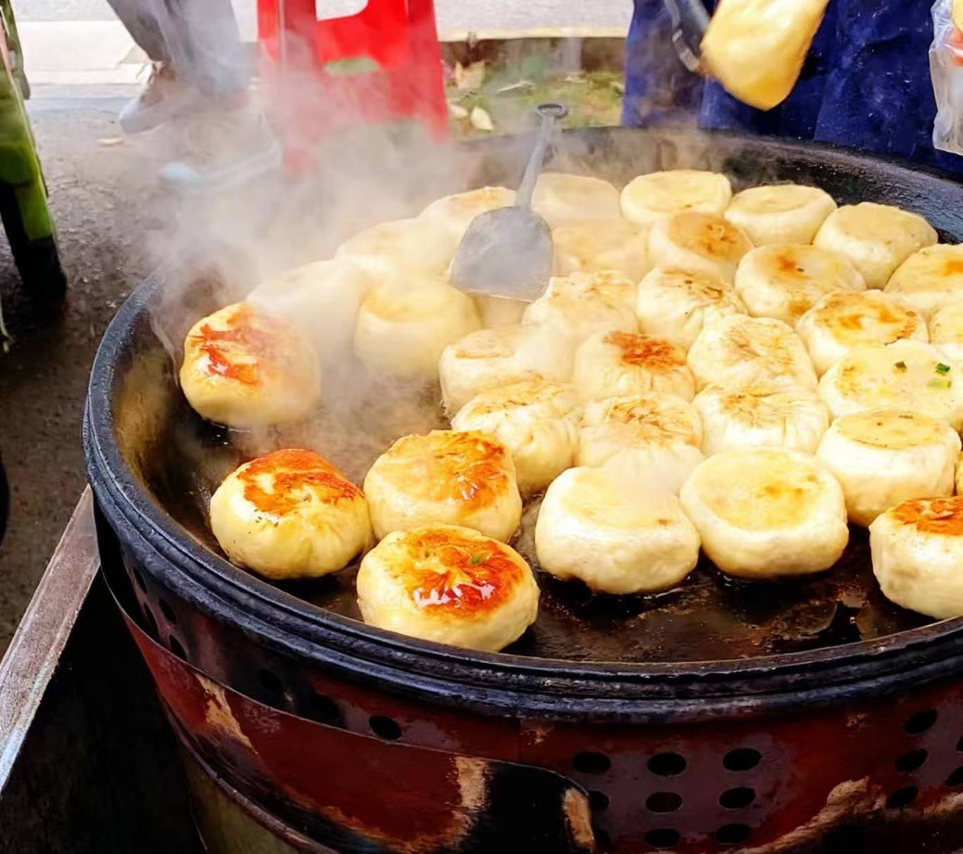 长江埠老街的砂子馍,是揣在手里的温暖。薄薄的面饼,埋进热砂里“炕”熟,外皮焦香,内里酥软,吃起来口感丰富,咸香四溢。不远处的水汽包子铺,铁盖掀开时白雾裹着肉香扑脸——包子用清水混植物油“炕”熟,外皮金黄带脆,咬开是鲜美的萝卜肉馅,趁热吃,暖手又暖胃。
