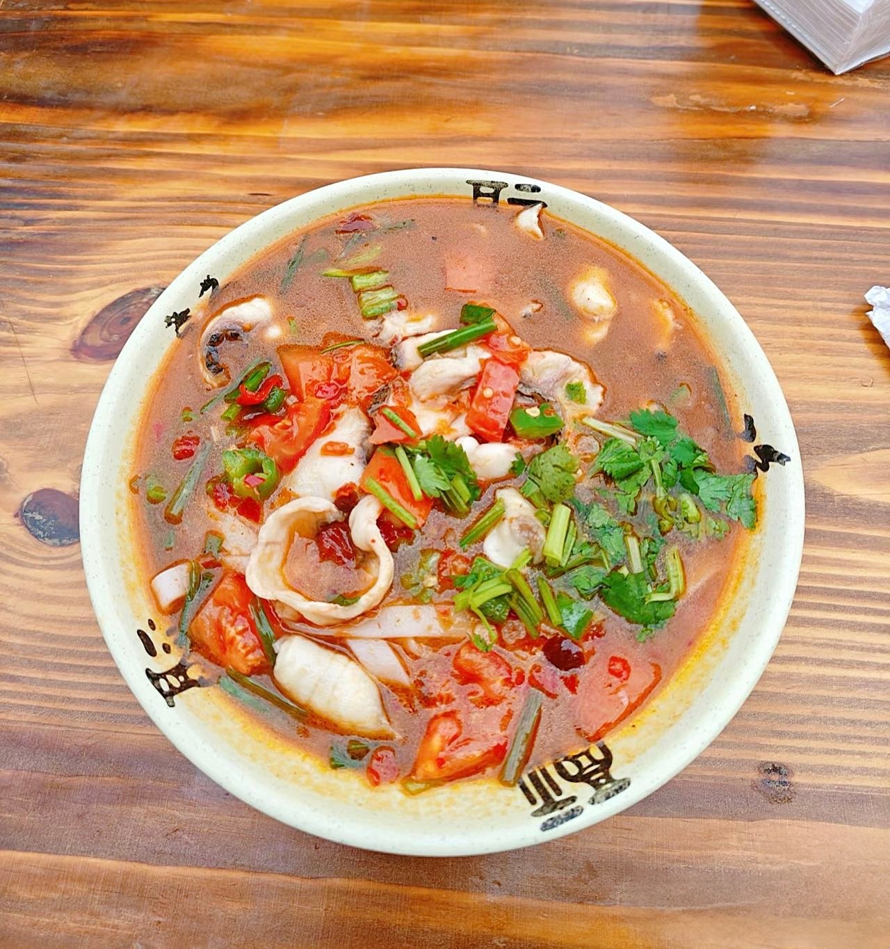 应城糊汤粉的精髓在“糊”字里。新鲜鲫鱼熬烂后拆骨取肉,加淀粉调成浓稠鱼汤,撒上胡椒粉与葱花,再添一勺应城盐调味,鲜得醇厚不齁。烫好的米粉浇上糊汤,撒一把虾米增鲜,搭配一根刚炸好的脆油条——把油条掰碎泡进汤里,酥软吸汤的瞬间,满是市井生活的满足感。