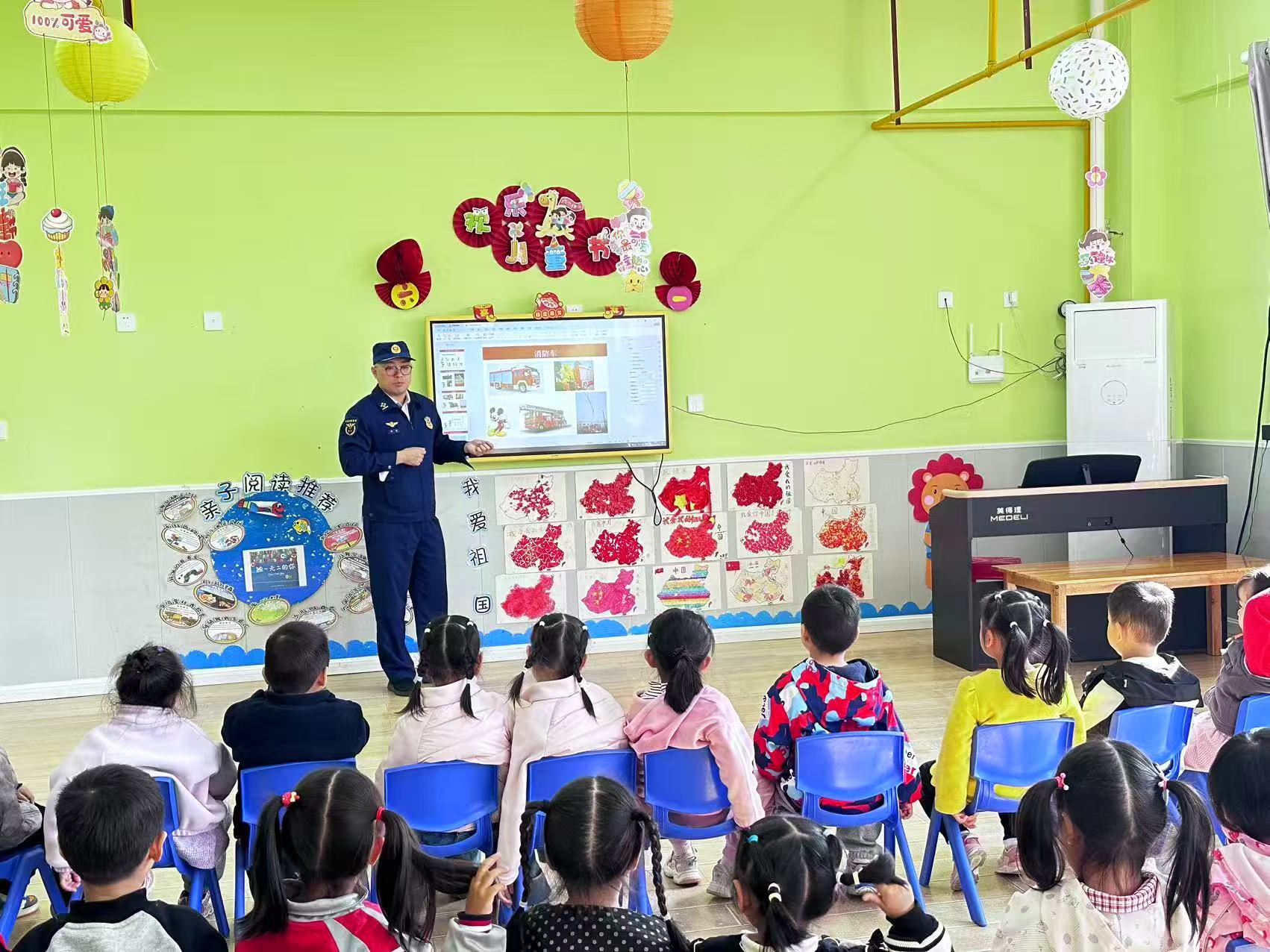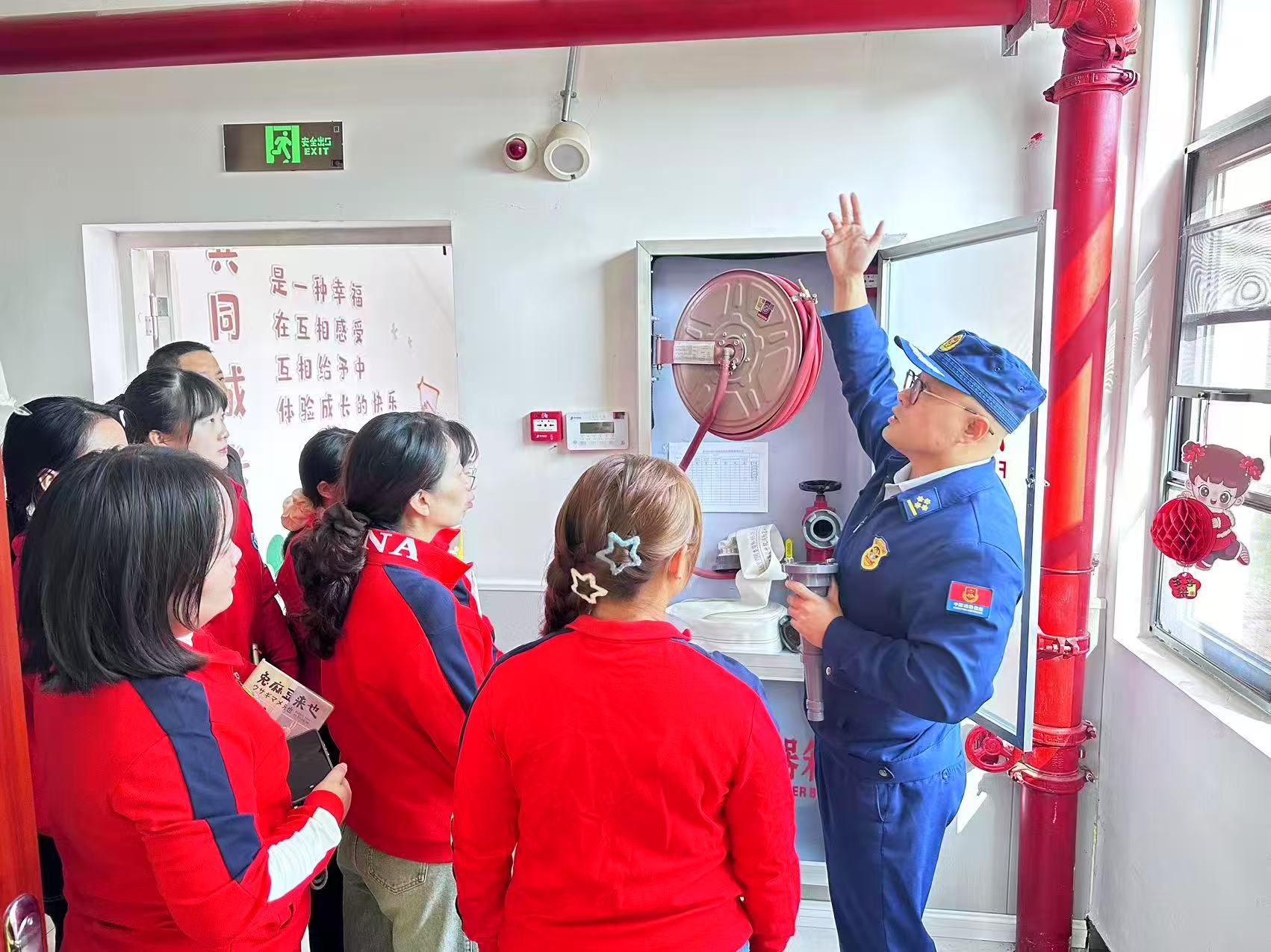 该幼儿园利用电子屏,紧扣“安全用火用电”,通过故事、视频开展消防安全教育。消防员为全体教职工开展器材使用培训,详细讲解灭火器“提、拔、握、压”操作口诀与消防水带使用方法。