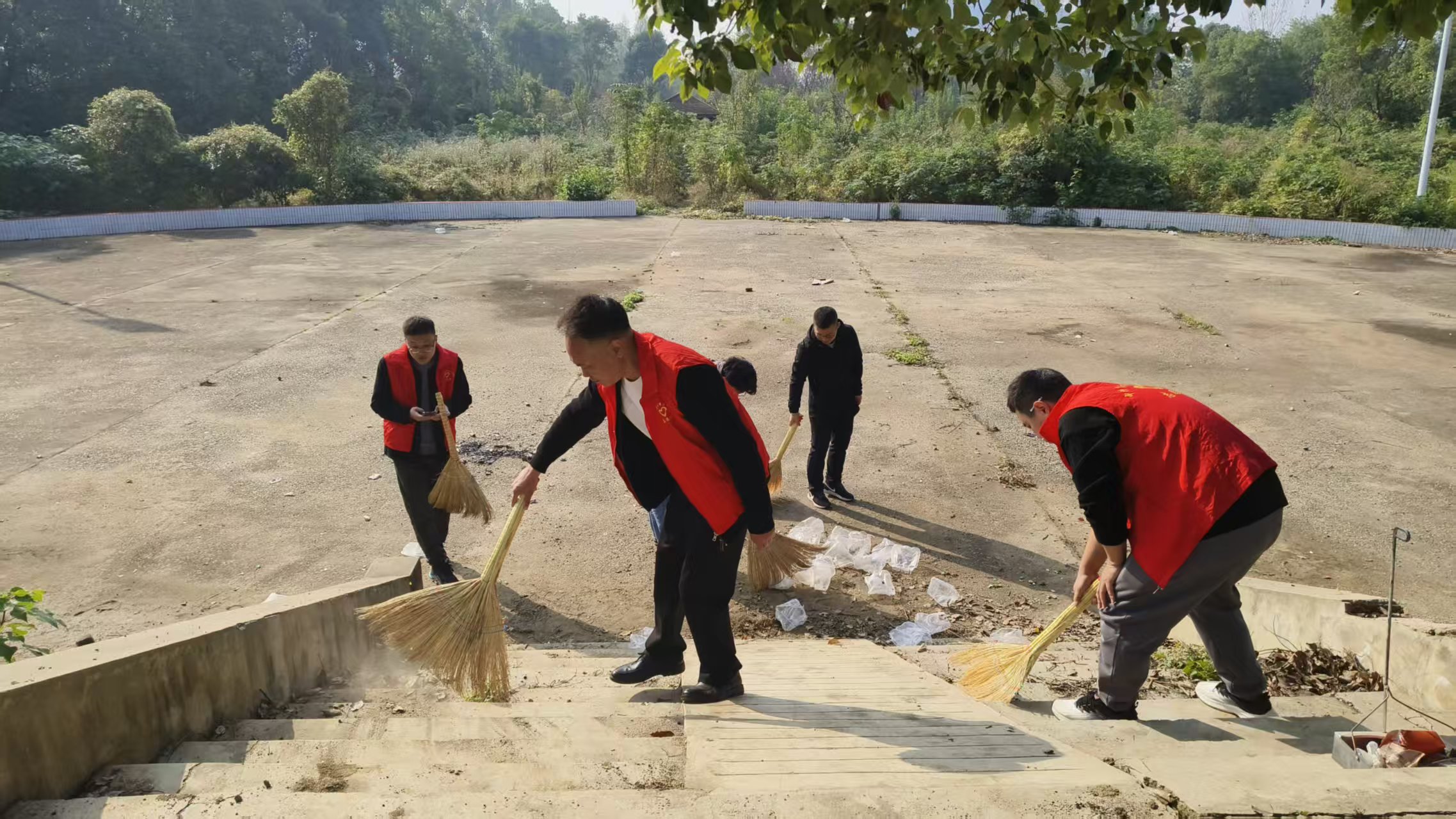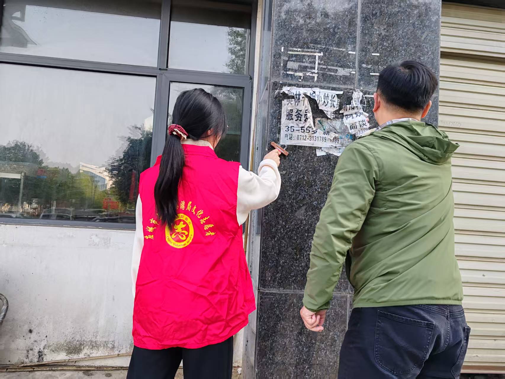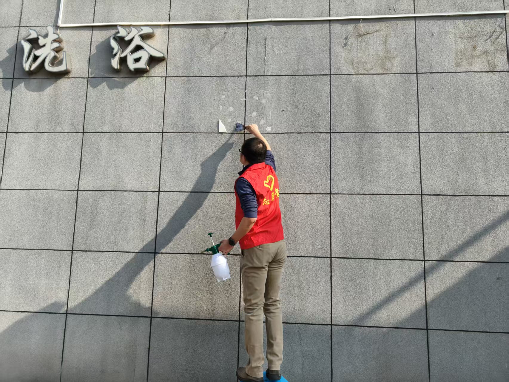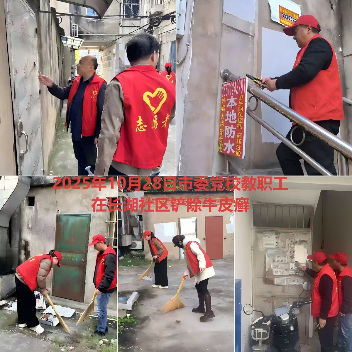 志愿者们手持扫帚、小铁铲、喷壶等工具,分工协作,有的清扫路面垃圾、白色污染物;有的重点铲除楼道、墙面及公共设施上的小广告“牛皮癣”,对顽固污渍反复擦拭清理。