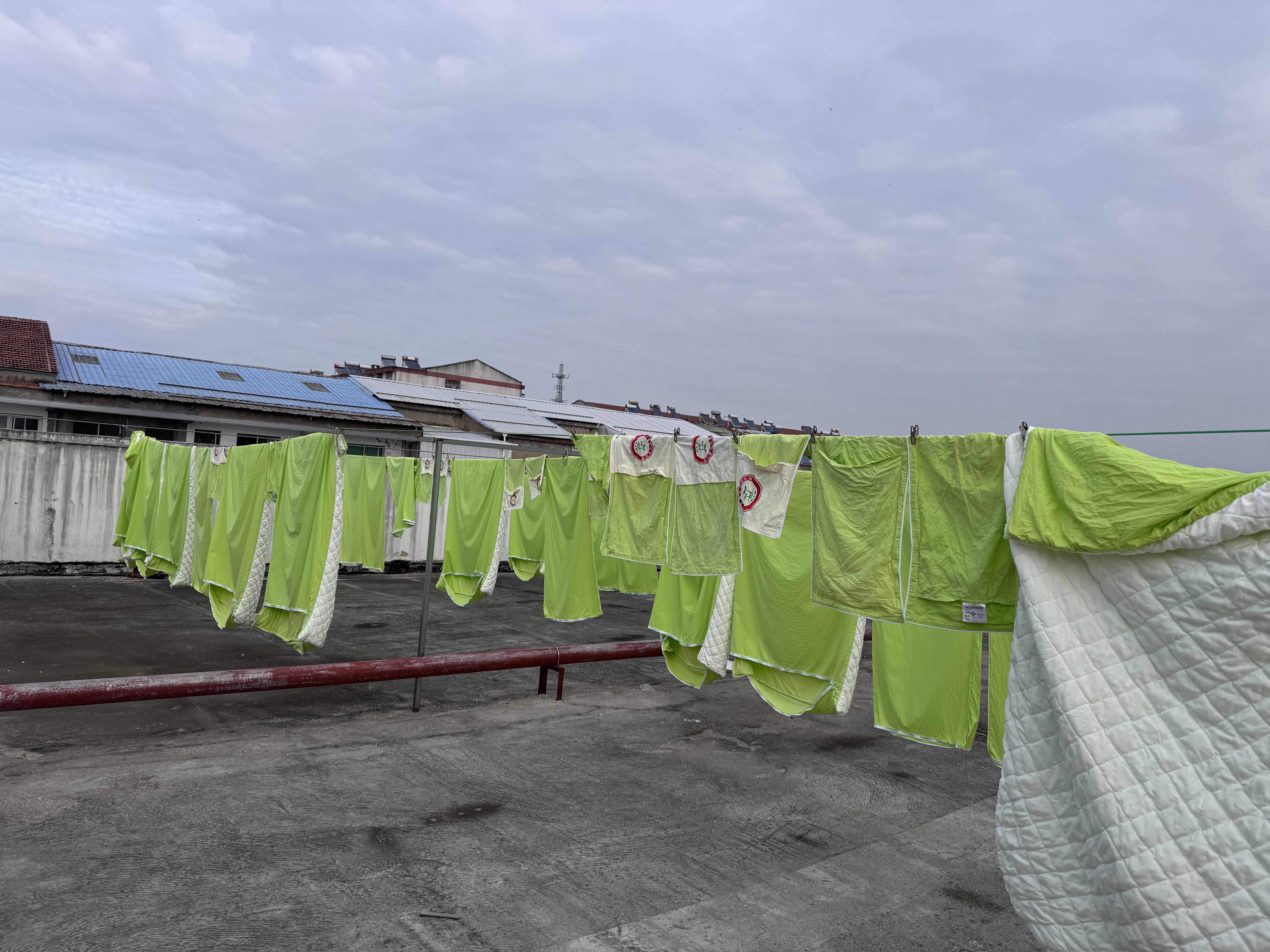 幼师们细心收集全园幼儿被褥,逐一清洗后铺展在晾晒区,通过定时“翻身”、轻拍除尘,让每一寸布料都充分接受阳光照射。