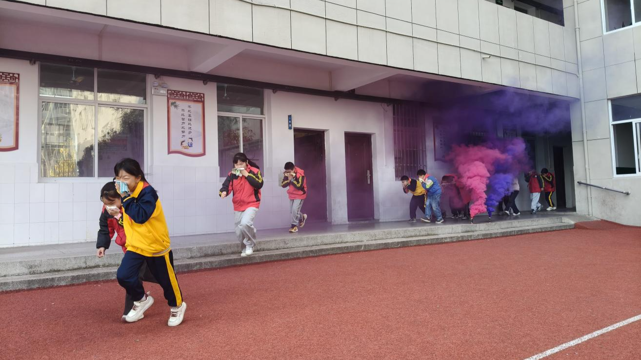 当天上午8时25分,随着急促的消防警报声,演练正式开始。各班级班主任迅速组织学生用湿毛巾捂住口鼻,弯腰低姿,沿着预定疏散路线快速、有序地向操场安全区域撤离。整个过程中,同学们听从指挥、不推不挤,教师们分工明确,在楼梯转角、楼门口等关键位置引导疏散,全程仅用1分35秒,全体师生便安全抵达指定集合点。
