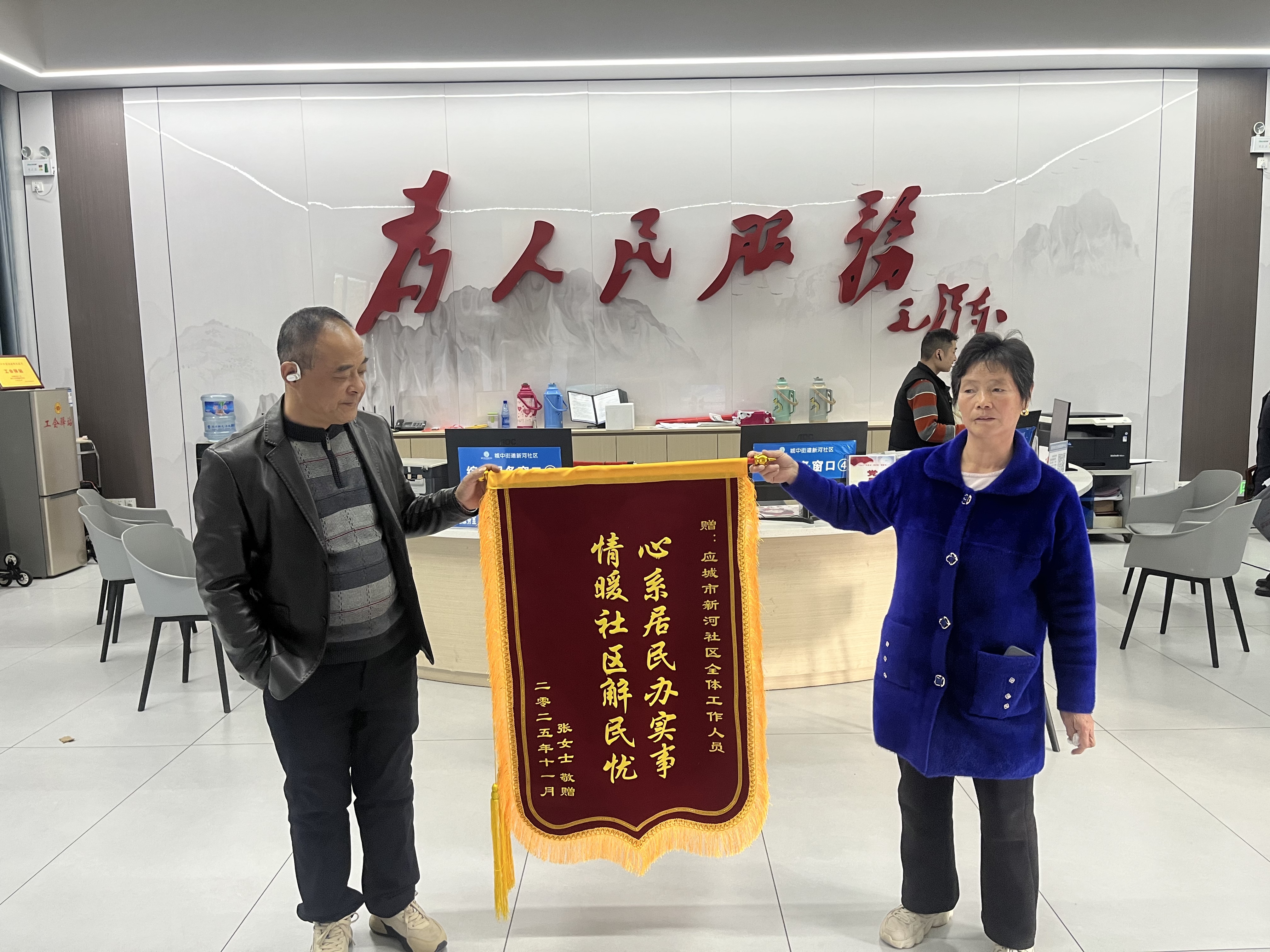 11月29日,应城市城中街道新河社区居民张女士带着一面写有“心系居民办实事 情暖社区解民忧”的锦旗,来到社区居委会,紧紧握住工作人员的手表达谢意。
