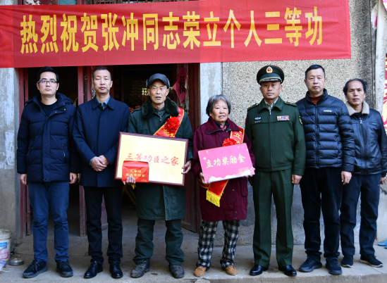 慰问现场热闹非凡,喜气洋洋。“你儿子张冲在部队荣立三等功,真为我们村争气,是我们三合人民的骄傲啊!”现场村民们纷纷为张冲的家人祝贺。
