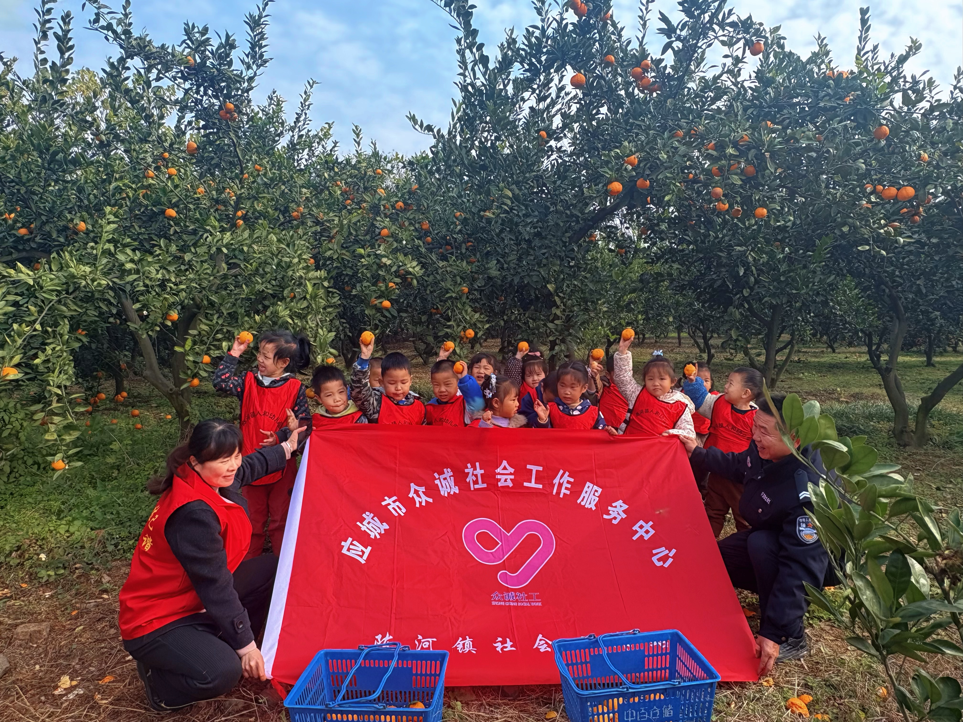 社工还与教师带领孩子们到毛河村采摘园采摘橘子,在体验劳动乐趣、亲近自然中加深了对家乡物产的认知。
