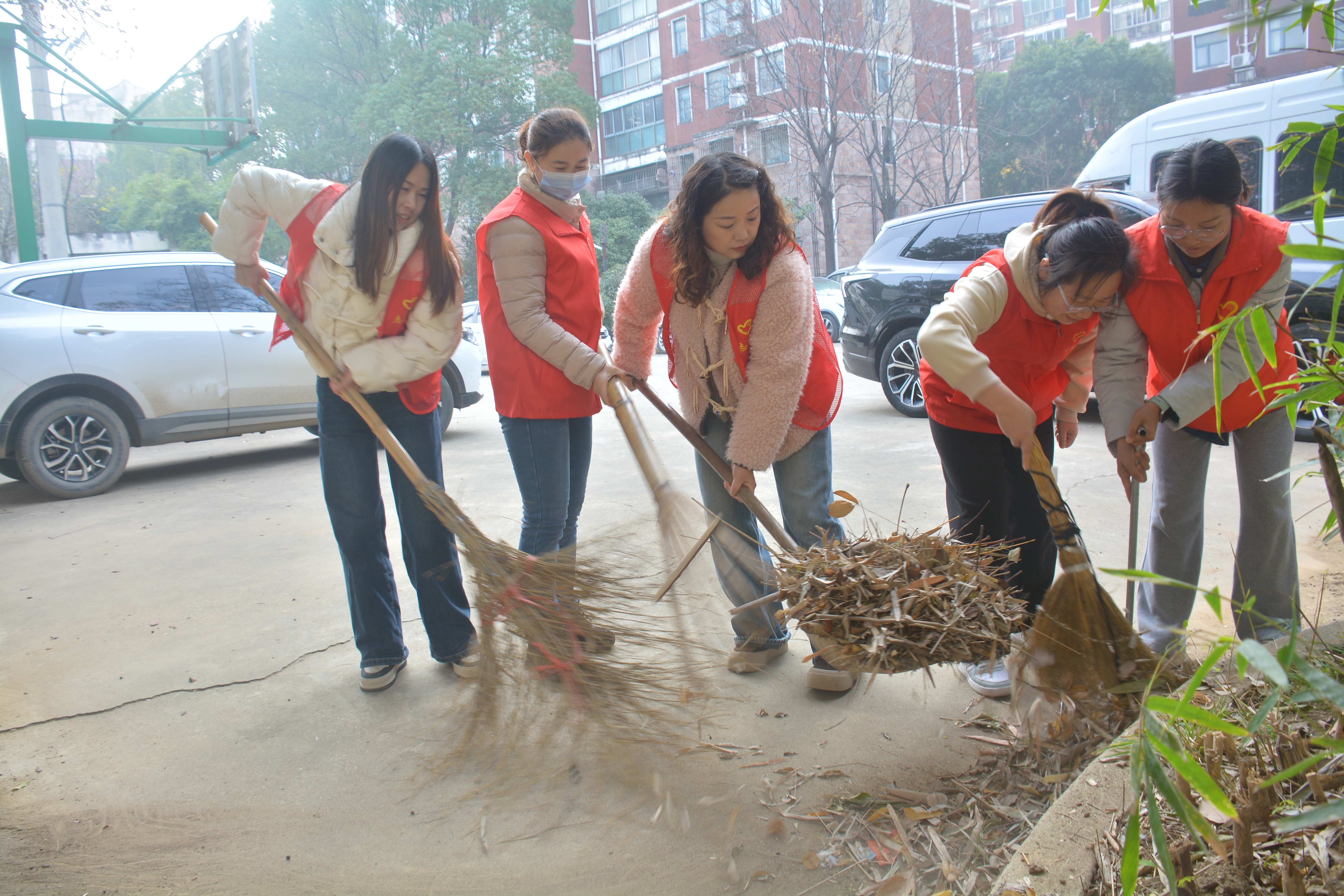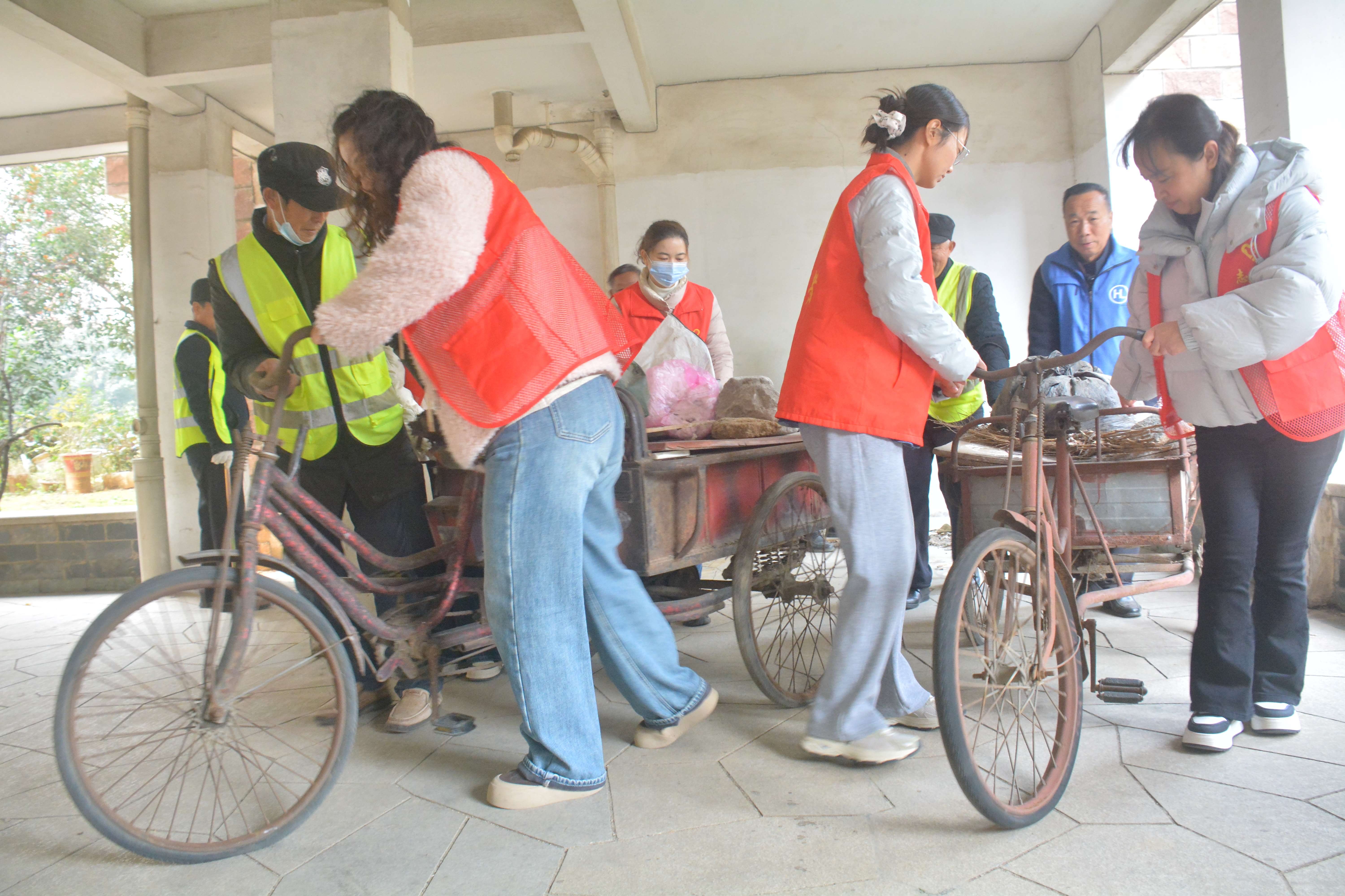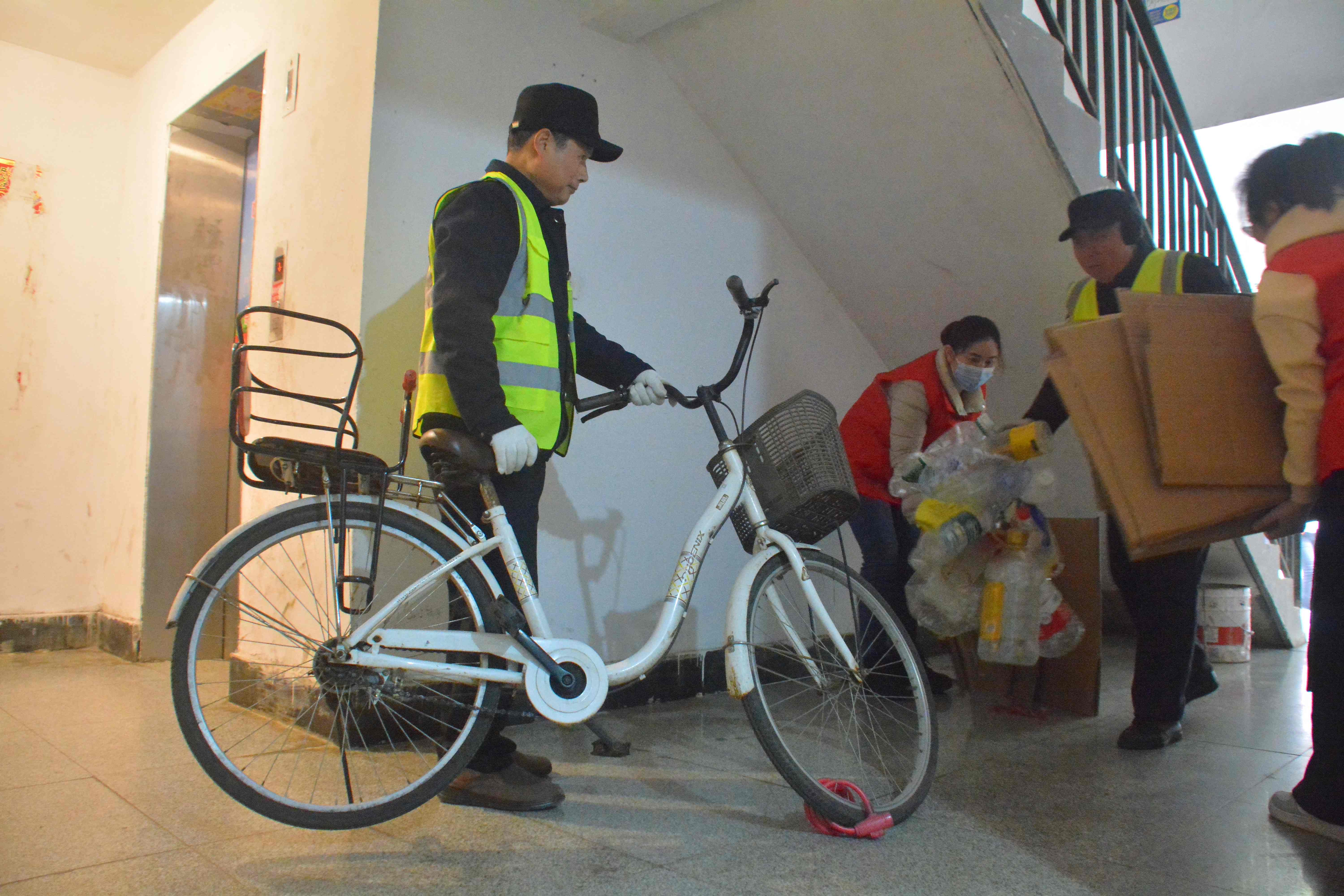 活动现场,大家手持扫帚、铁锹、垃圾袋等工具,化身“环境美容师”,对楼道内废弃家具、纸箱、塑料瓶等杂物进行逐一清理。