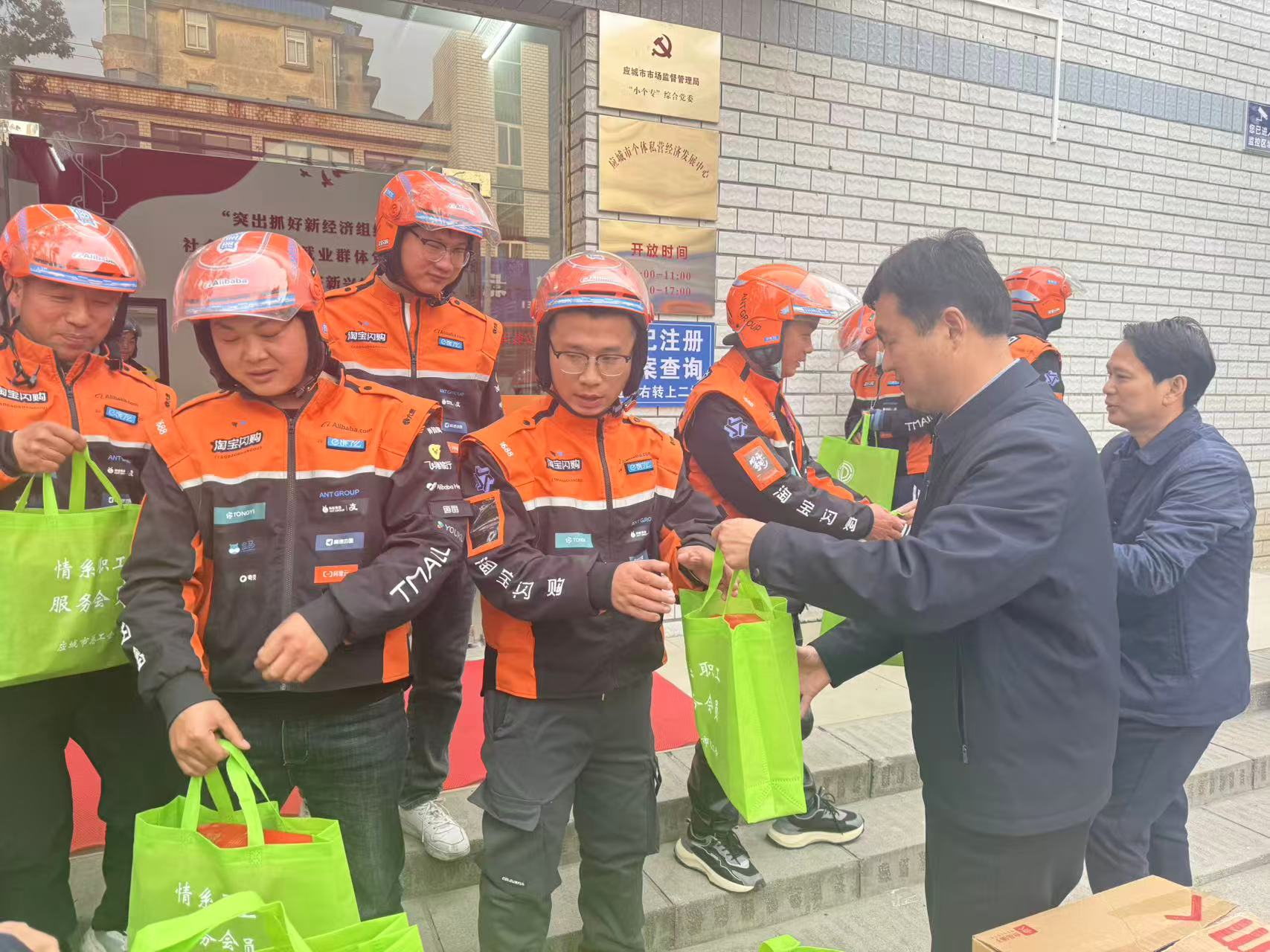 工作人员还为新业态劳动者发放暖心物资,提供政策咨询、健康检测等便民服务。