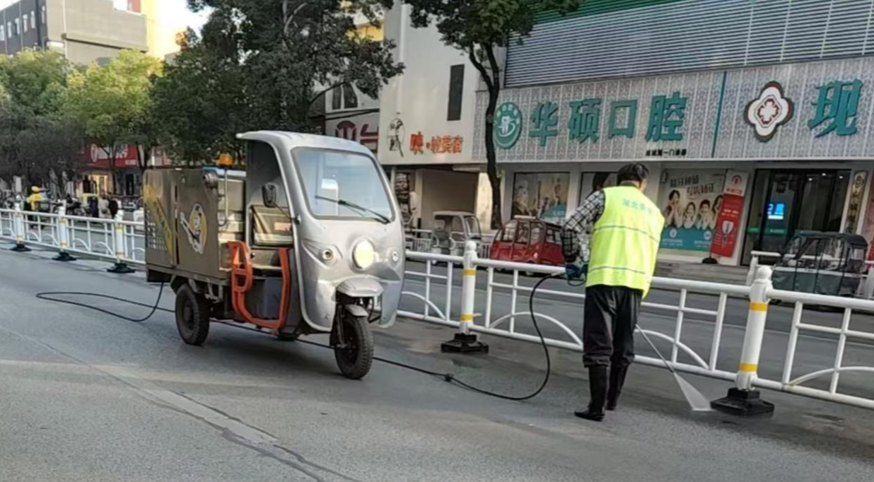 应城市环境卫生服务中心积极推行精细化保洁,采取“人机协同”与“抱管冲洗”作业模式,确保机械作业精准覆盖:白天安排2台洒水车清洗非机动车道,夜间则对人行道进行系统性抱管冲洗。人工精洗深入细节:组织保洁人员对路沿石、公交站台、交通护栏进行“擦洗式”清理,利用小型设备清除卫生死角,实现保洁全方位、无盲区。