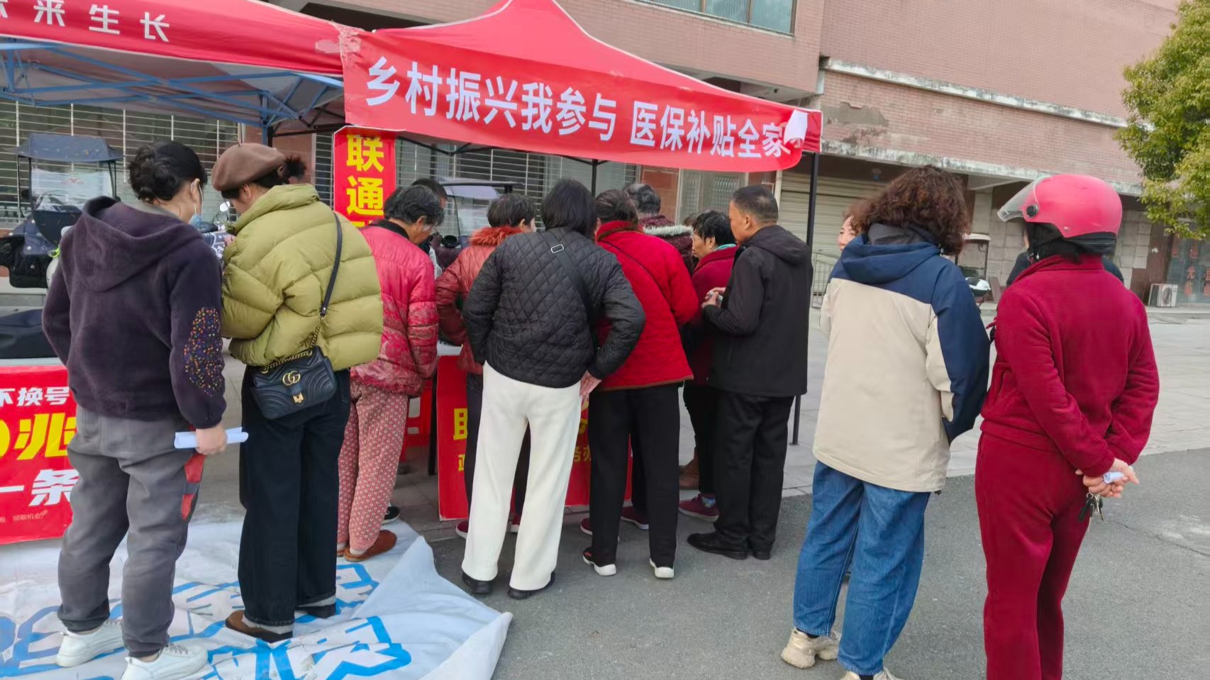 12月11日,应城市城中街道长湖社区在居委会门前开展医保缴费便民活动,联动联通运营商同步办理医保补贴申领,并为居民发放惠民礼品。