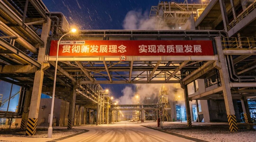 双环科技的厂区内,化工装置平稳运行,灯火在飞雪中晕开一圈圈暖黄的光。