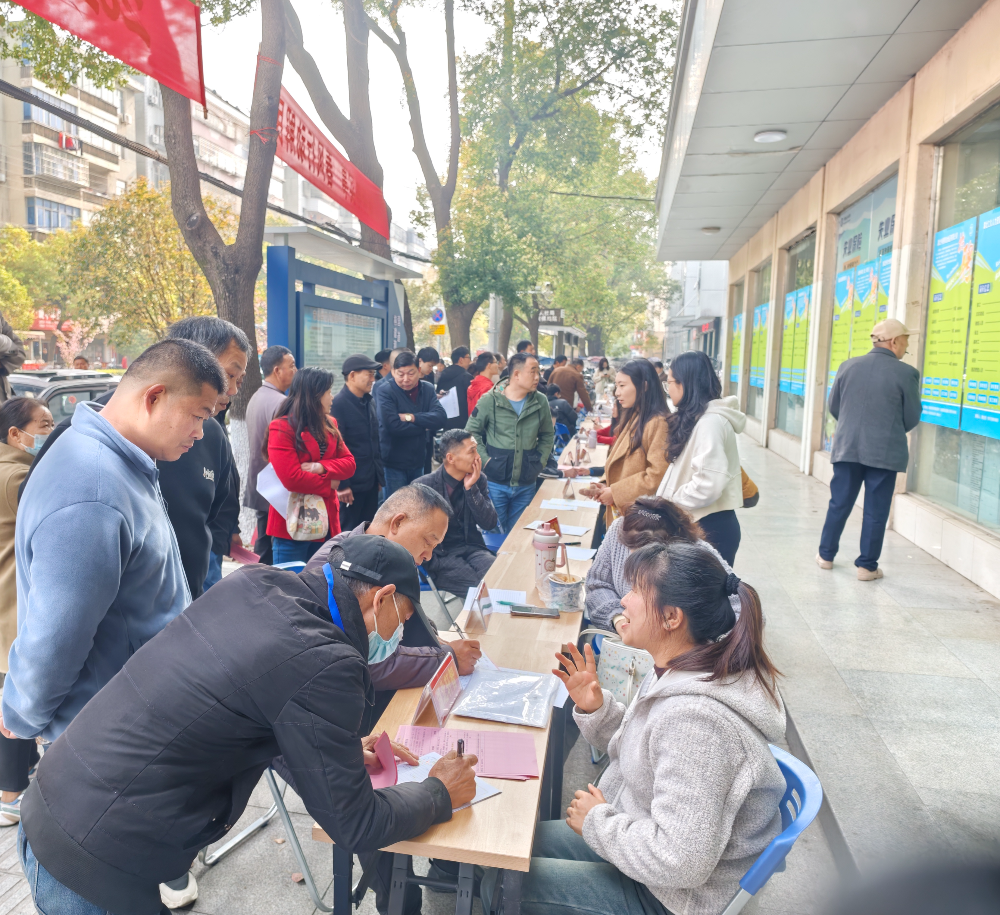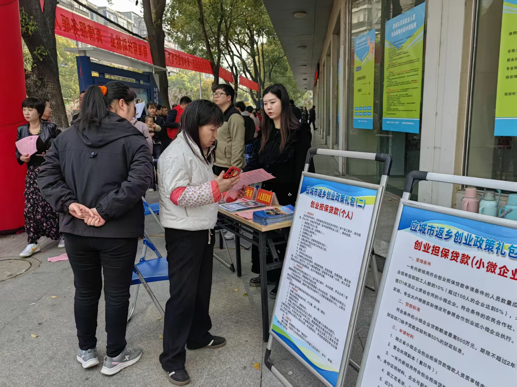 3月27日,应城市人力资源和社会保障局组织工作人员,在应城市公共就业服务中心门前举办返乡人员专场招聘会。