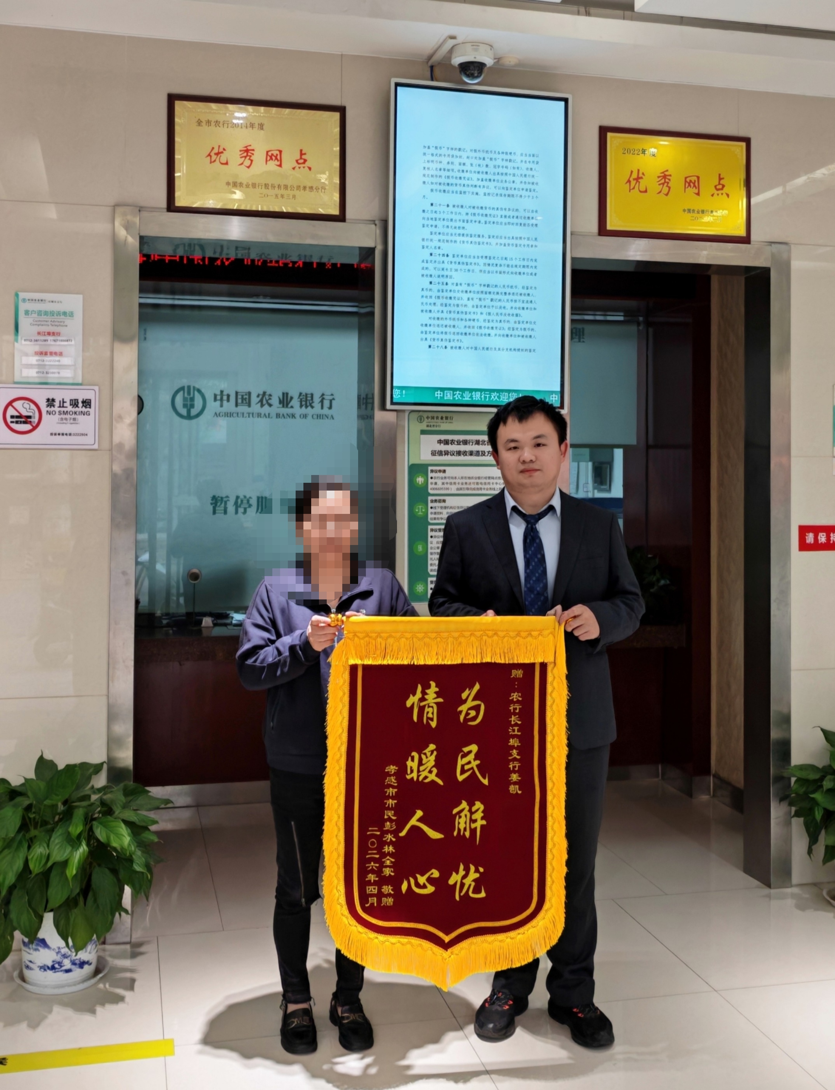 4月7日,农行应城长江埠支行收到一面印有“为民解忧,情暖人心”的锦旗,这份跨越千里的致谢,承载着上海定居老人彭先生一家对网点贴心服务的真挚认可。