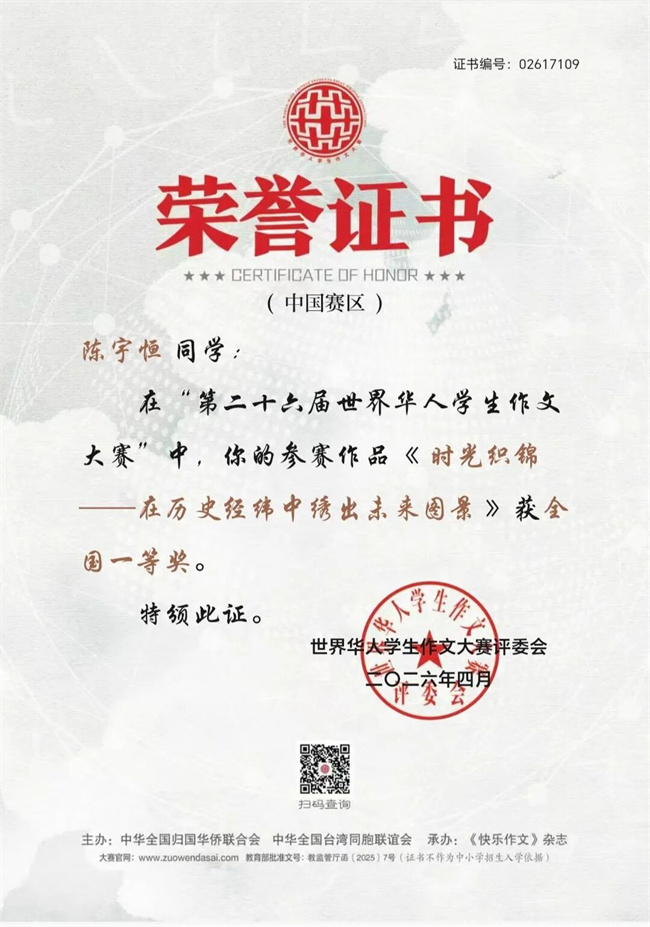 据悉,世界华人学生作文大赛由中国侨联、全国台联共同主办,赛事入选教育部2025--2028学年面向中小学生的全国性竞赛活动名单。
