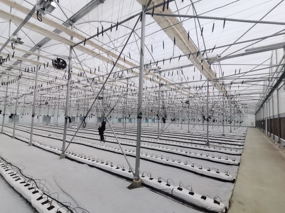 记者走进“番茄公社”的果蔬温室大棚看到,新栽种的数千株番茄幼苗有序排列、长势正旺;一根根黑色滴灌导管嵌入无土基质,紧靠番茄幼苗根系;补光灯、气象站、降温风机湿帘等现代化设施农业设备引人注目。