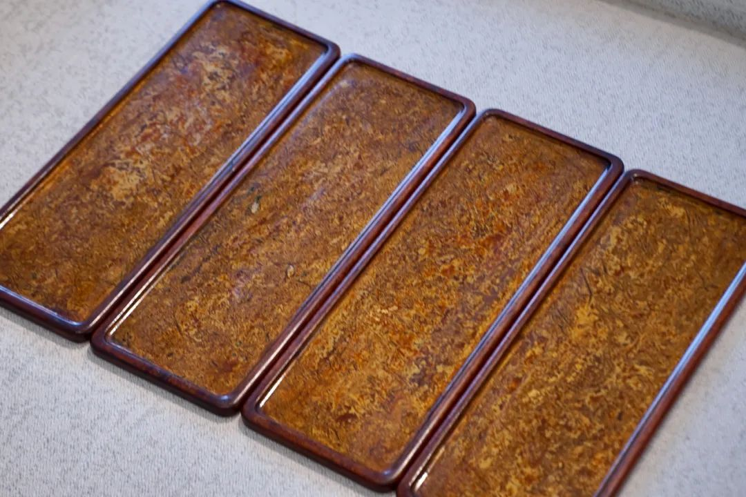 应城非遗传承人管好伟,他年幼时受外公洪获麟漆艺熏陶,用大漆去制作一些板凳和家具供家里使用,洪获麟先生会因地制宜地应用一些应城独有的物产进行彰髹技法的制作。