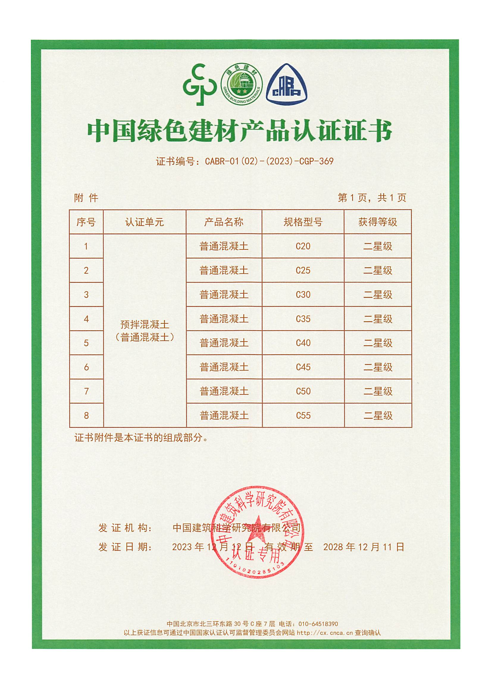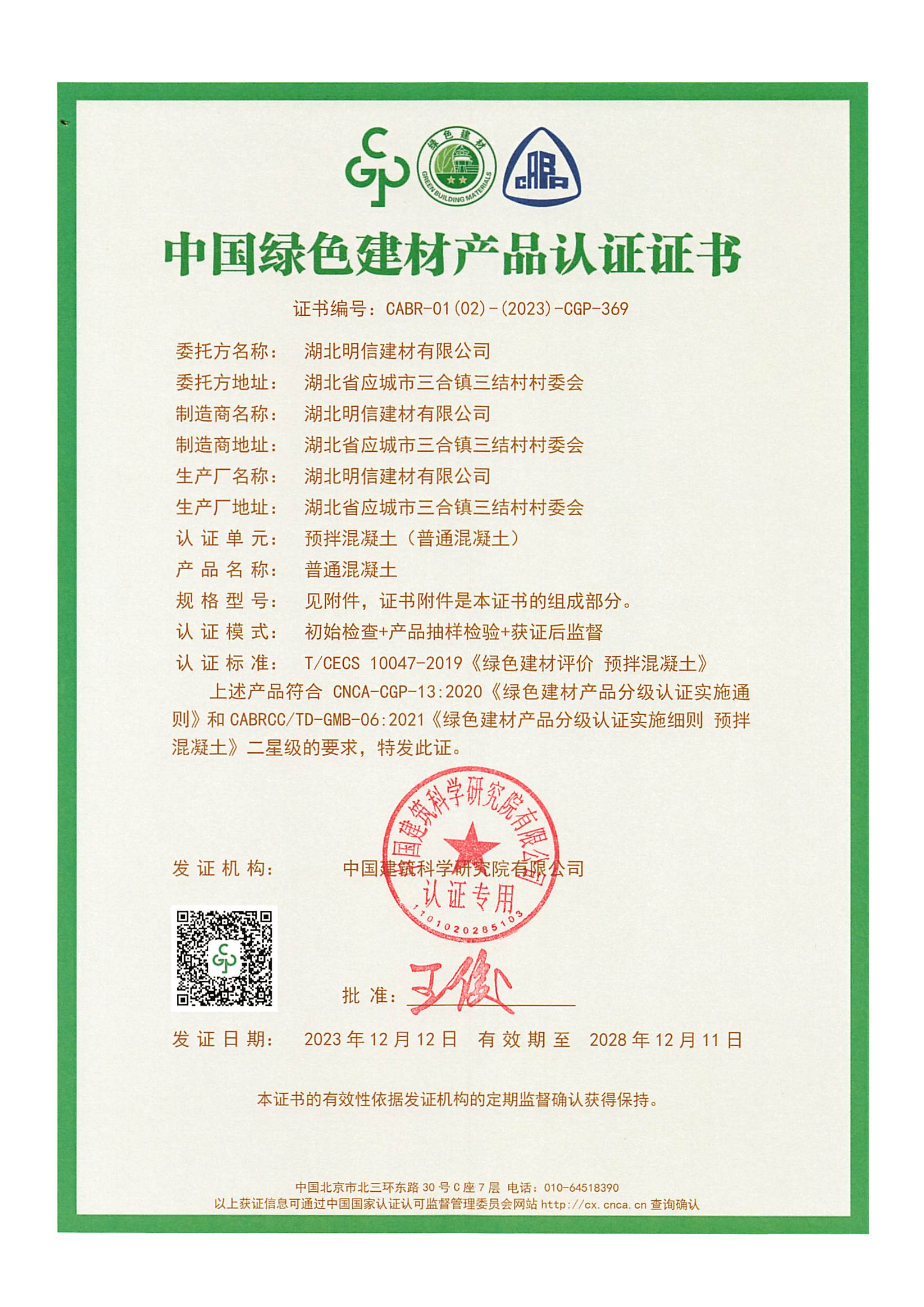 12月12日,湖北明信建材有限公司生产的预拌混凝土成功通过国家认证,获得“中国绿色建材产品认证证书”,获评“二星级”,成为应城市首家通过绿色建材产品认证的商砼企业,也是应城市首个通过认证的绿色预拌混凝土产品,成功实现该类型绿色建材产品认证零的突破。