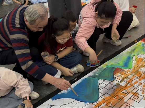 活动现场,百米长卷沿文化客厅空间缓缓铺开,小朋友们化身 “小小创作者”,围绕中秋团圆主题尽情挥洒色彩,月亮、玉兔等传统元素在画卷上逐步呈现。志愿者穿梭其间提供指导,现场满是童真笑语,热闹又温馨。