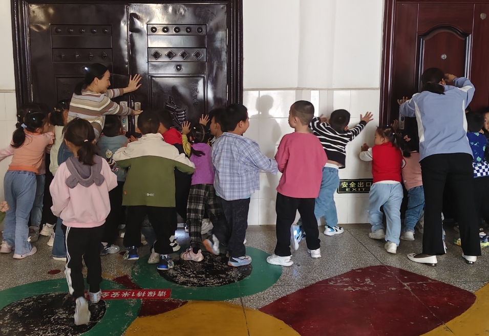 老师们听到警报提醒后,立即组织幼儿紧急避险,迅速将孩子们带到安全区域,抵住门窗,防止“暴徒”进入。孩子们在老师的引导下,躲进教室角落,关闭门窗。大家屏住呼吸,安静地听从老师指挥,展现出良好的秩序和应急意识。
