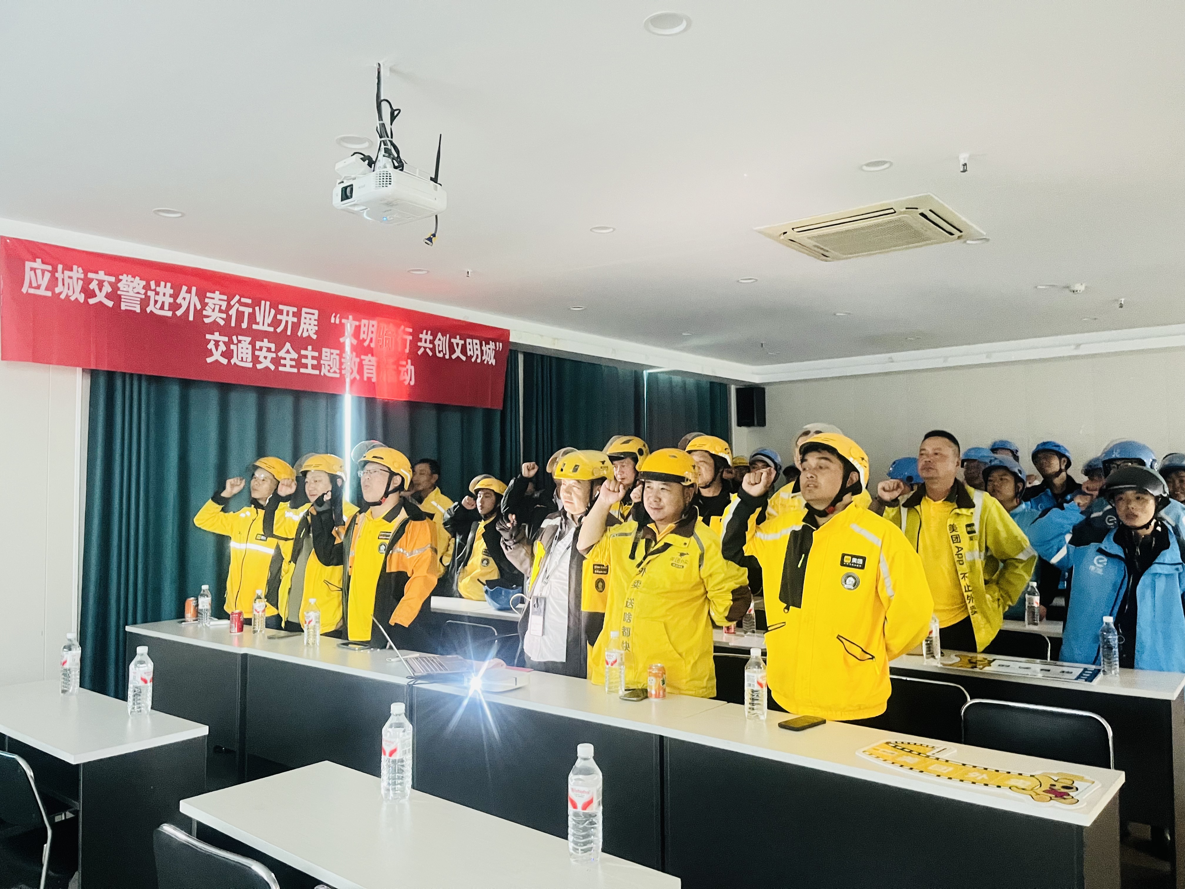 “我承诺,严守交通法规,文明骑行配送,为创建文明应城贡献力量!”在交警宣传员带领下,美团、饿了么骑手举起右拳,庄严进行文明驾驶集体宣誓。