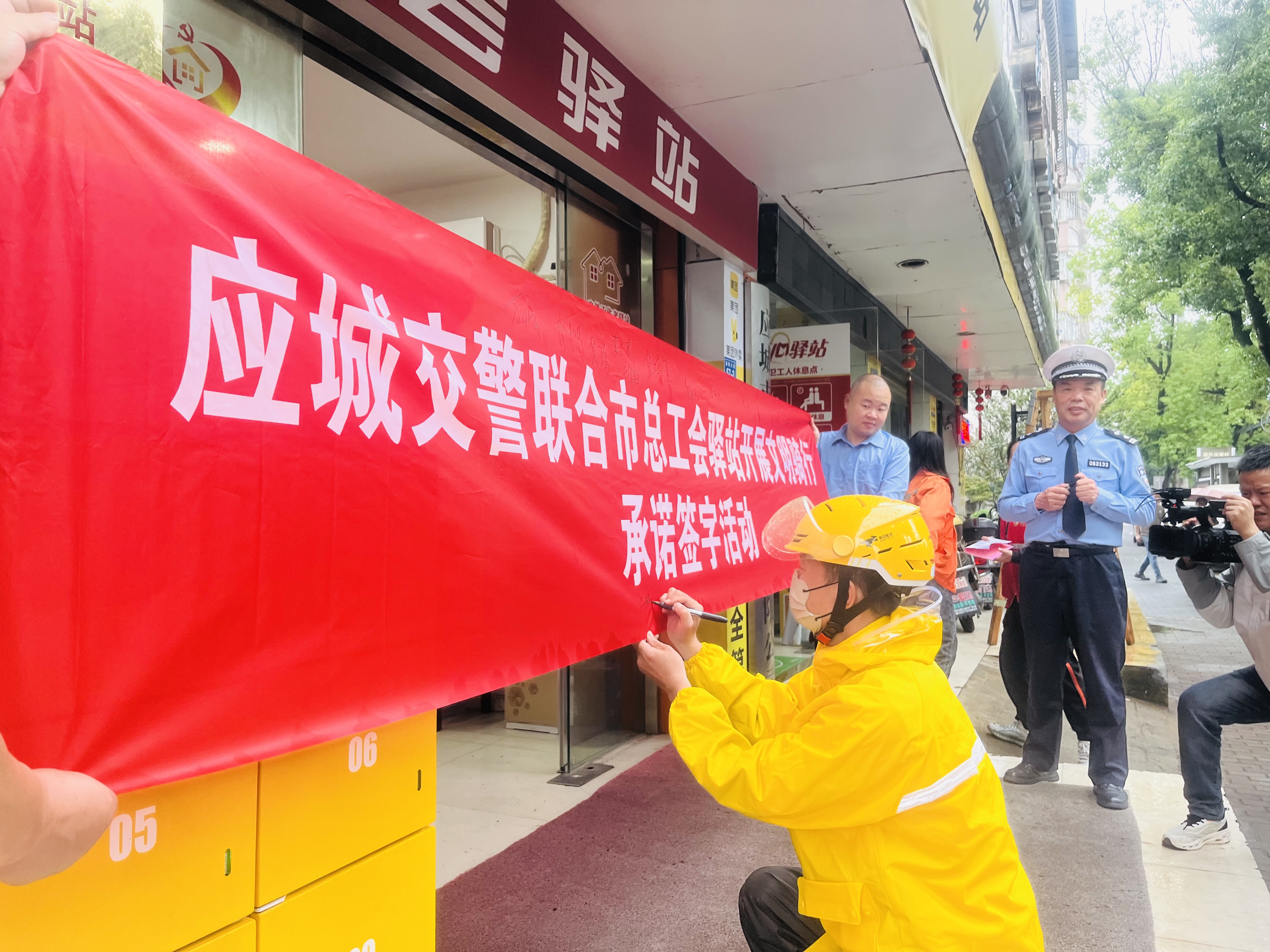 应城公安交警还延伸宣传触角,走进应城市总工会各个驿站,组织环卫工人与外卖骑手共同参与文明驾驶承诺签字活动,将文明出行责任牢牢刻在心上,以“小群体”带动“大文明”,为城市交通添上一抹安全亮色。