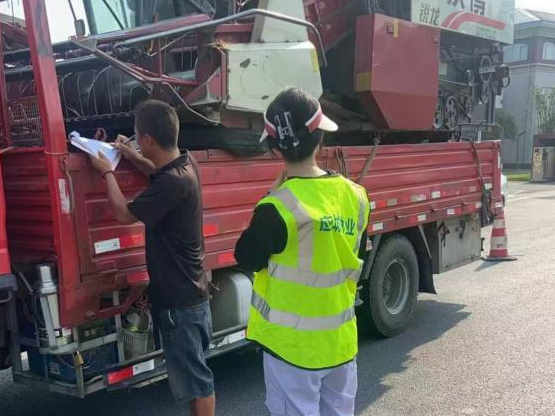 工作人员在指定路口设立临时服务点,主动为过往跨区作业联合收割机等农业机械提供路线指引、政策咨询等便捷服务;协助做好交通秩序维护,确保农机安全、顺畅、高效通过,保障秋收关键时节农机有序流动。