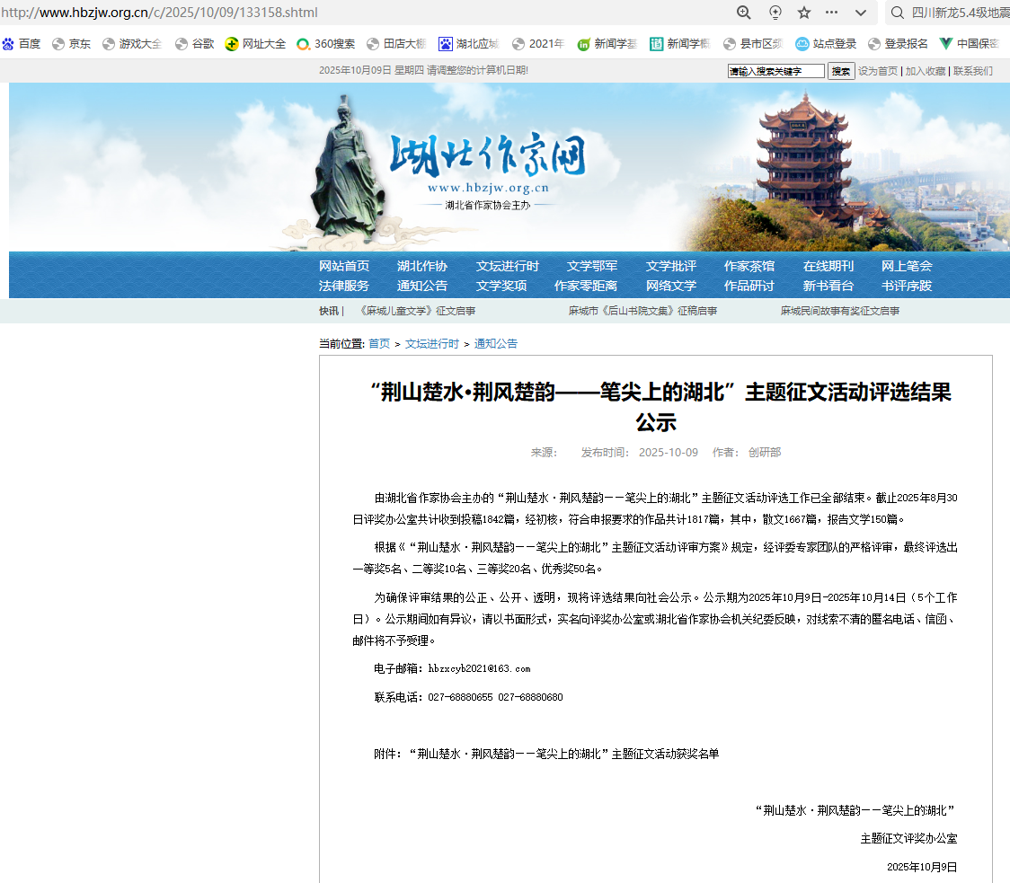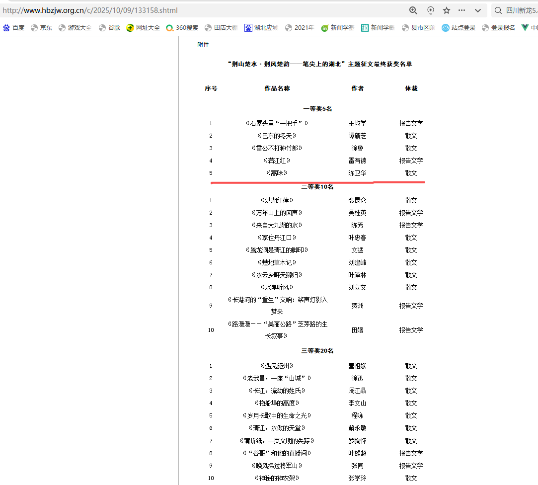10月9日,“荆山楚水·荆风楚韵——笔尖上的湖北”主题征文评奖办公室通过湖北作家网发布此次评选结果公示名单,应城市退休干部陈卫华撰写的散文作品《蒿味》喜获一等奖。