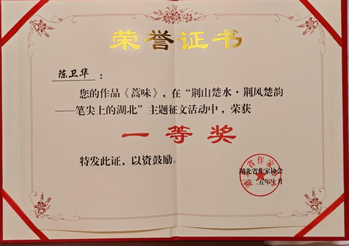 据悉,应城市陈卫华的散文作品《蒿味》在不久前湖北省委宣传部、省作家协会主办的“荆山楚水、荆风楚韵——笔尖上的湖北”主题征文活动中脱颖而出,荣获一等奖。本次活动吸引国内外文学爱好者踊跃参与,共收到1800余篇有效稿件,经专家、学者严格评审,最终评选出一等奖4名、二等奖10名、三等奖50名。