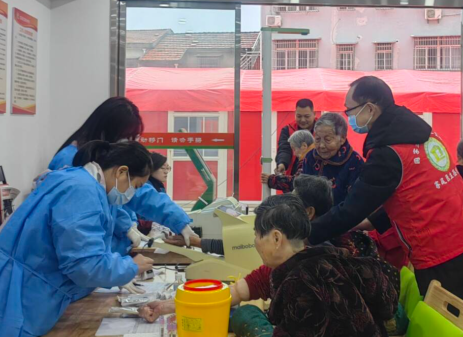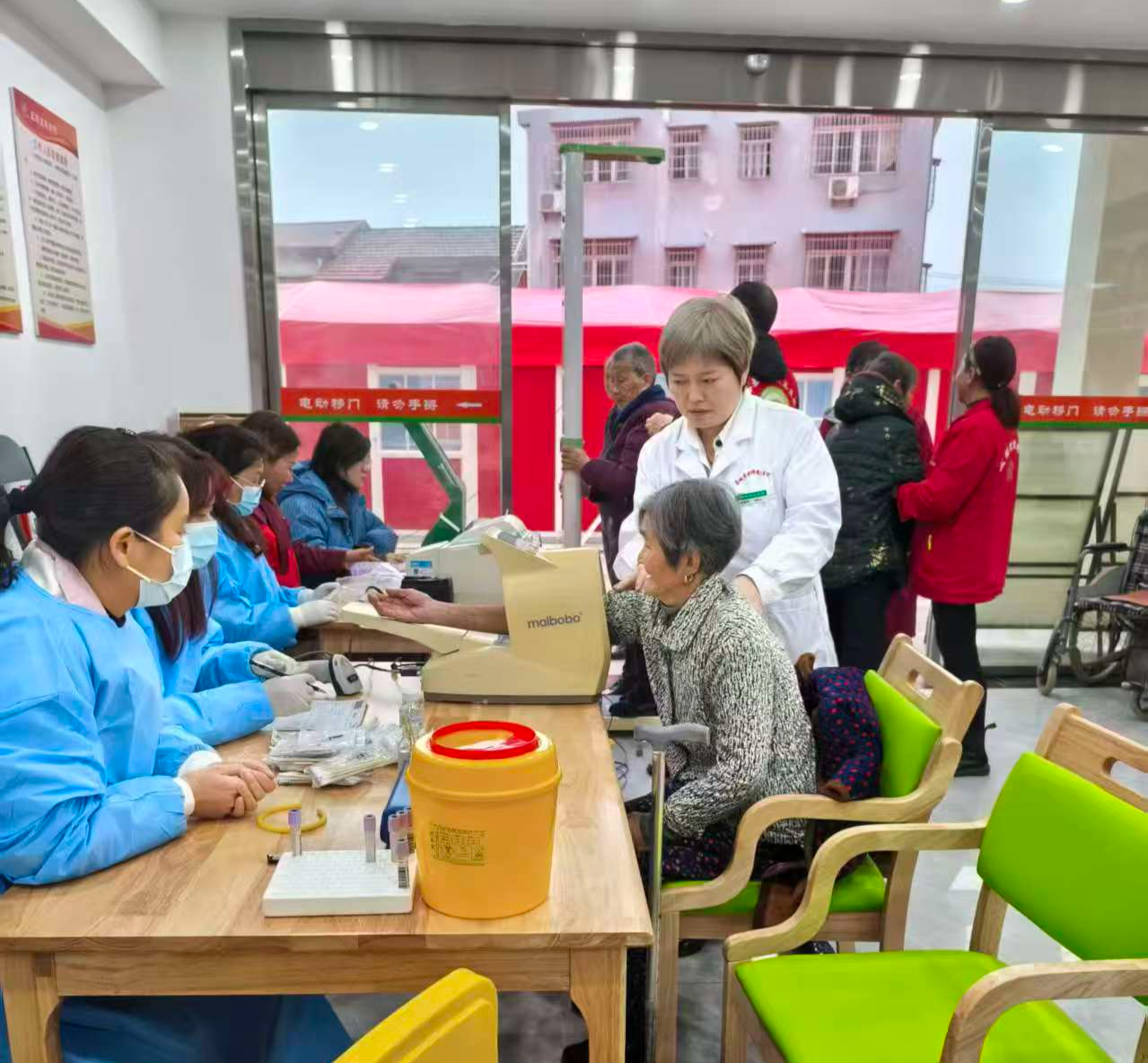 活动现场,医务人员为老人测量血压、血糖,开展心肺听诊常规检查,提供健康咨询和用药指导。