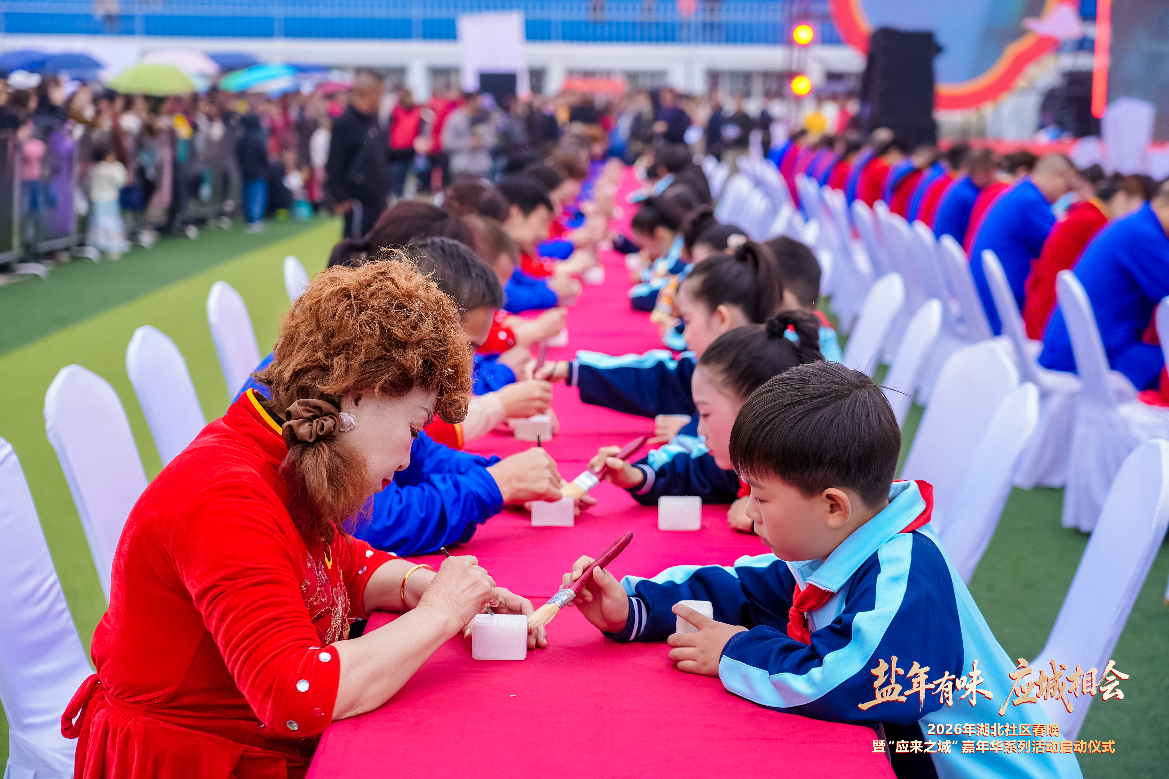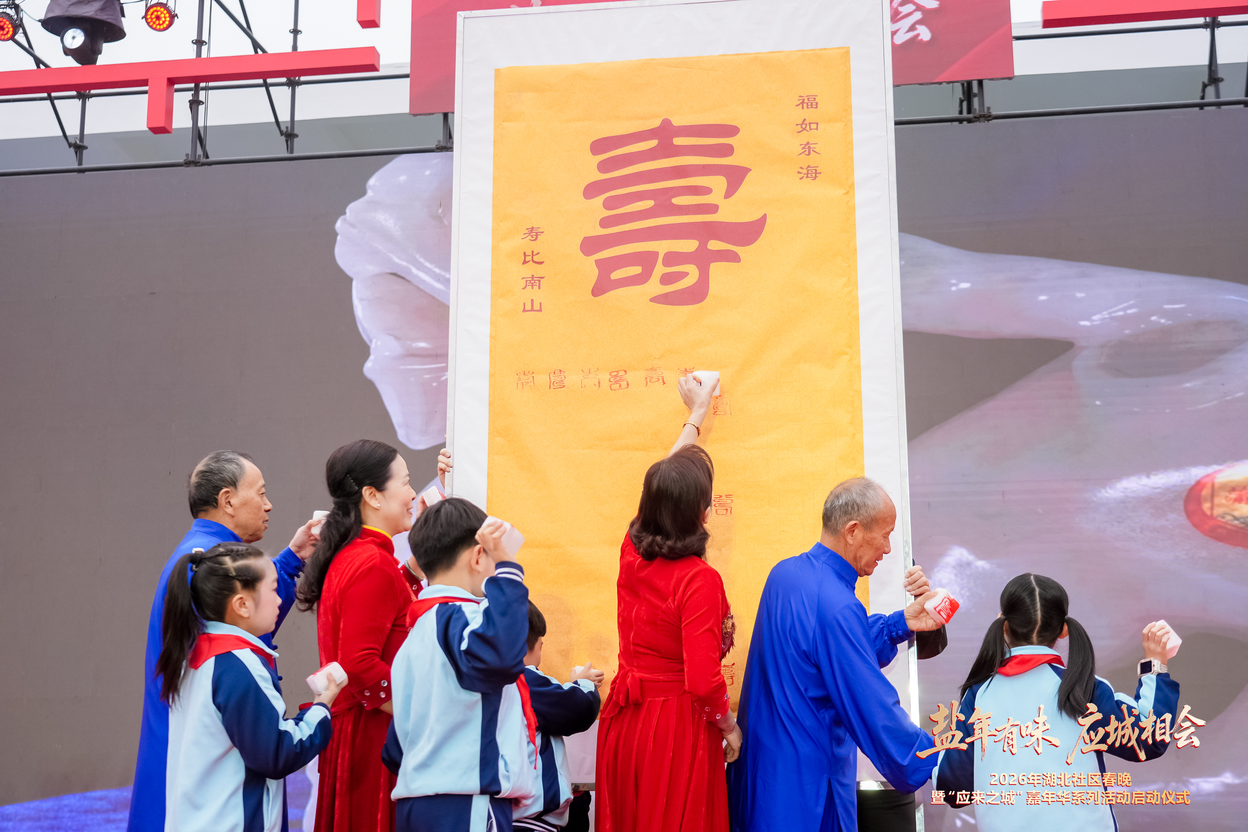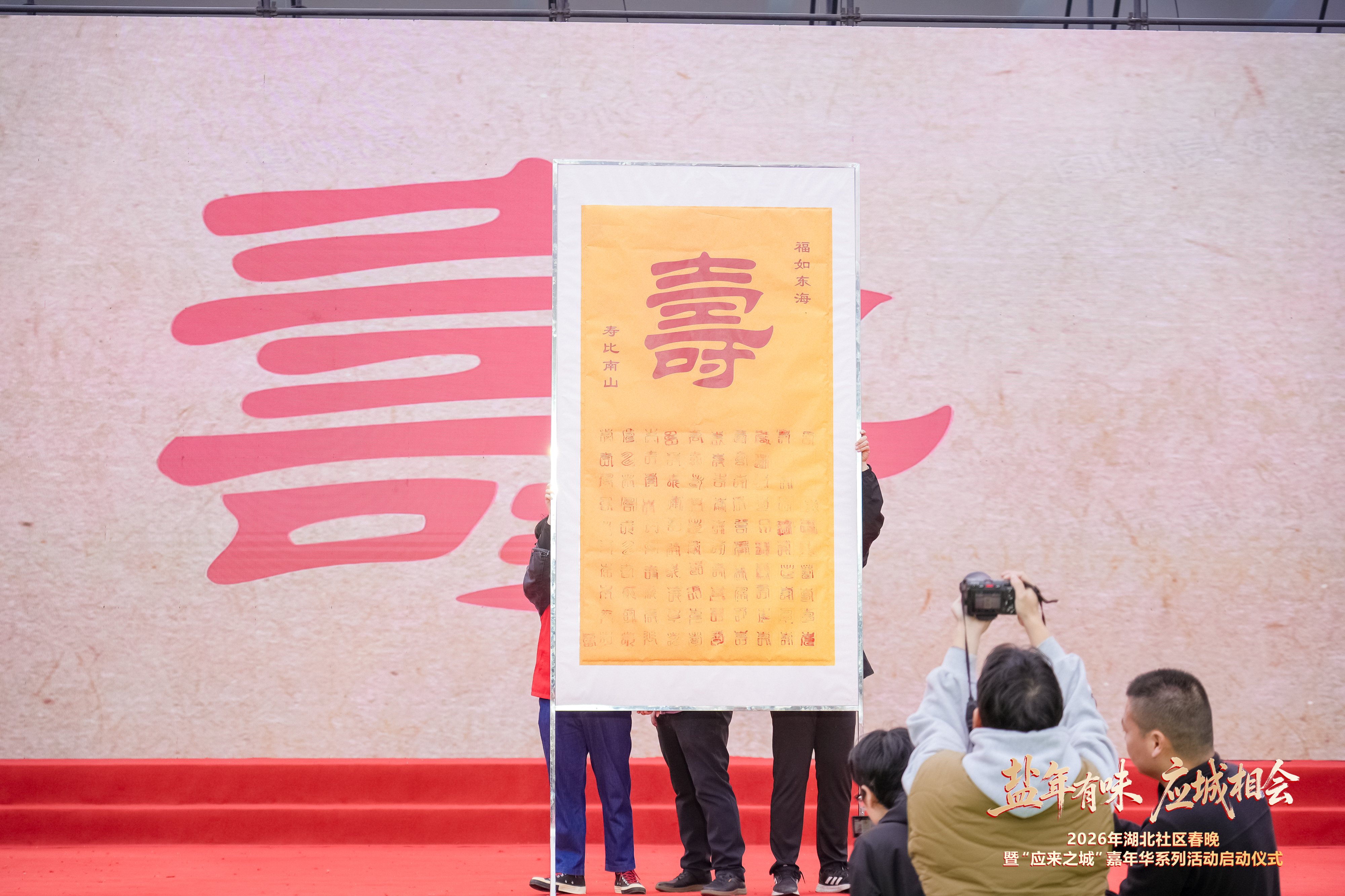 在舒缓的民乐伴奏中,银龄长者和孩子们共同走上舞台,开始拓印凝聚着祝福的《百寿图》。这一百个形态各异的“寿”字,不仅展现了应城膏雕的精湛技艺,更承载着对长者最美好的祝愿。