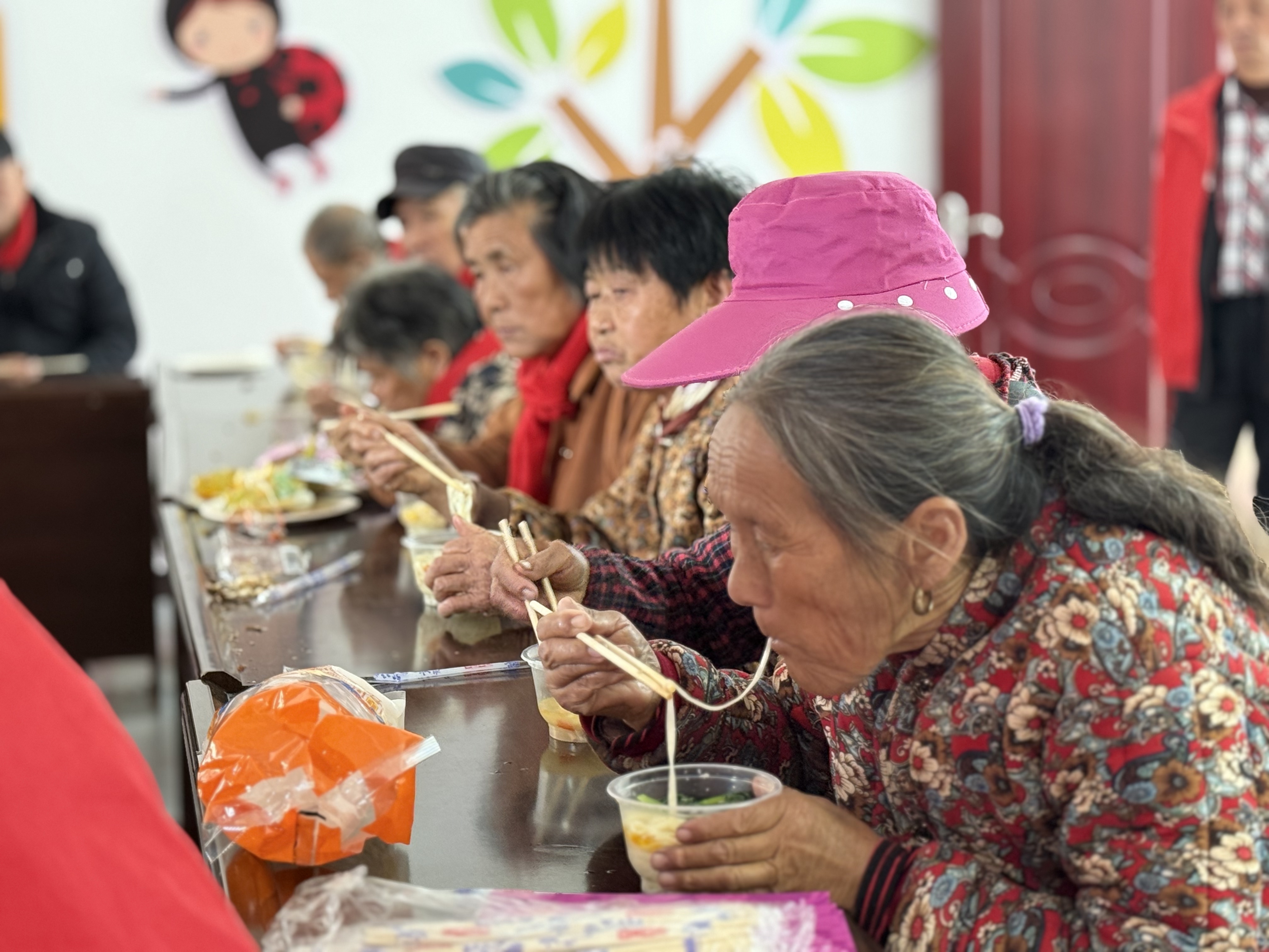 临近傍晚,老人们围坐在一起,品尝着可口的“长寿面”,彼此聊着家常,场面温馨热闹。