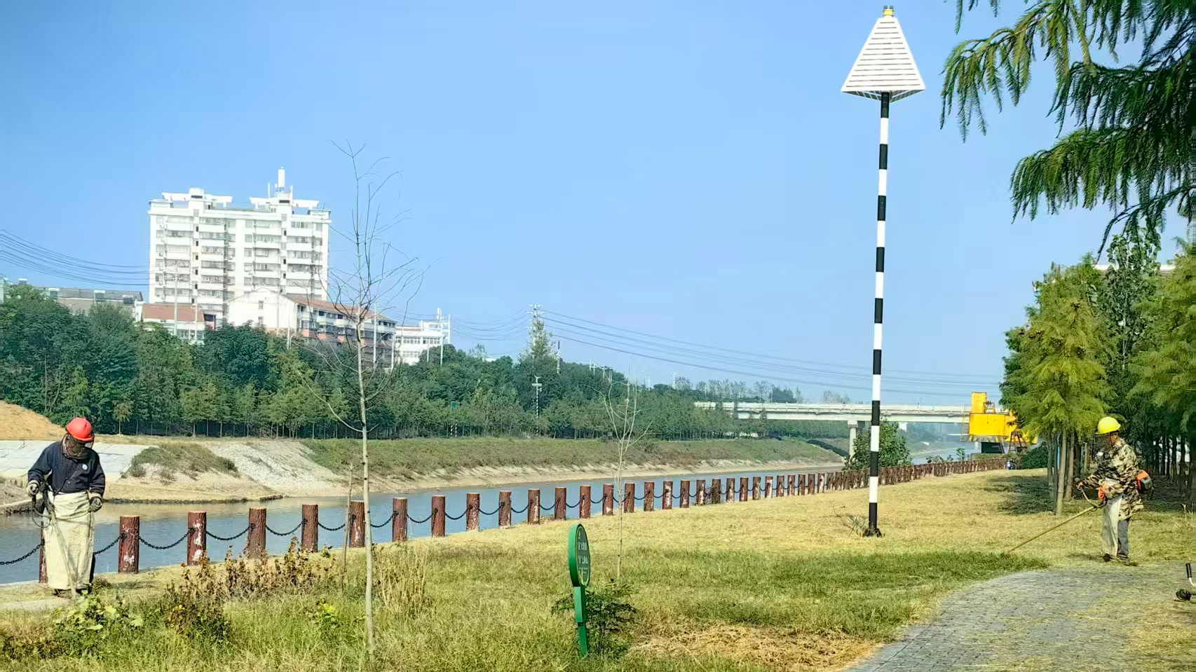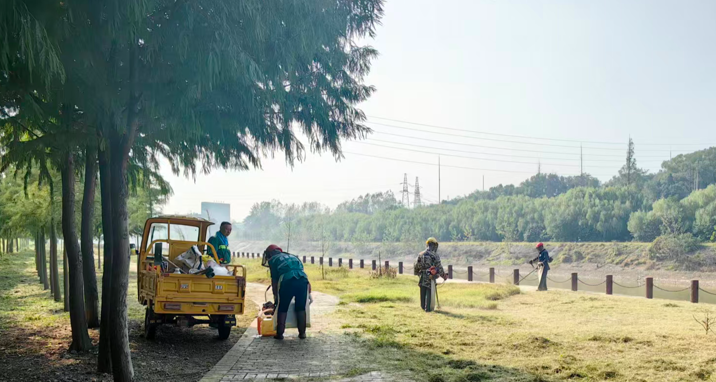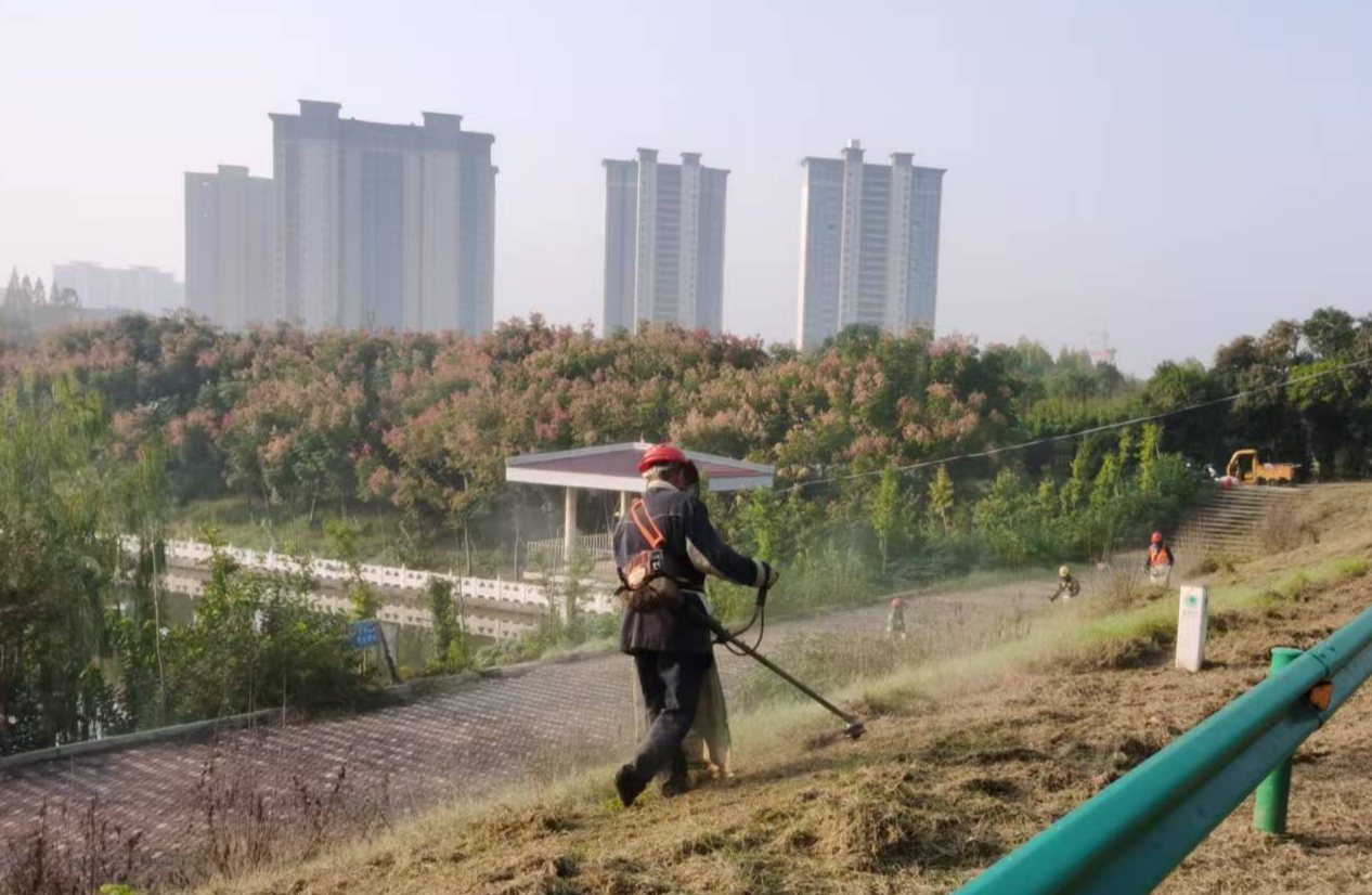工作人员分工协作,清理河堤杂草及空闲地废弃杂物,当天清理杂草 800 平方米,清运垃圾 12 车,让河道环境焕然一新。