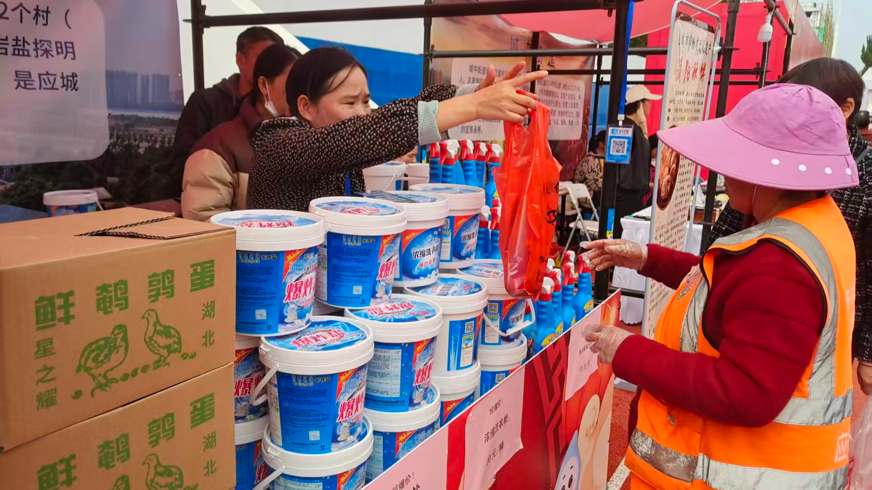 近日,“盐年有味 应城相会”市集在应城市文体中心足球场热闹开展。在应城市四里棚展位上,清洁用品、特色农产品琳琅满目。游客可凭“喝彩贴”在“喝彩墙”为心仪乡镇投票。