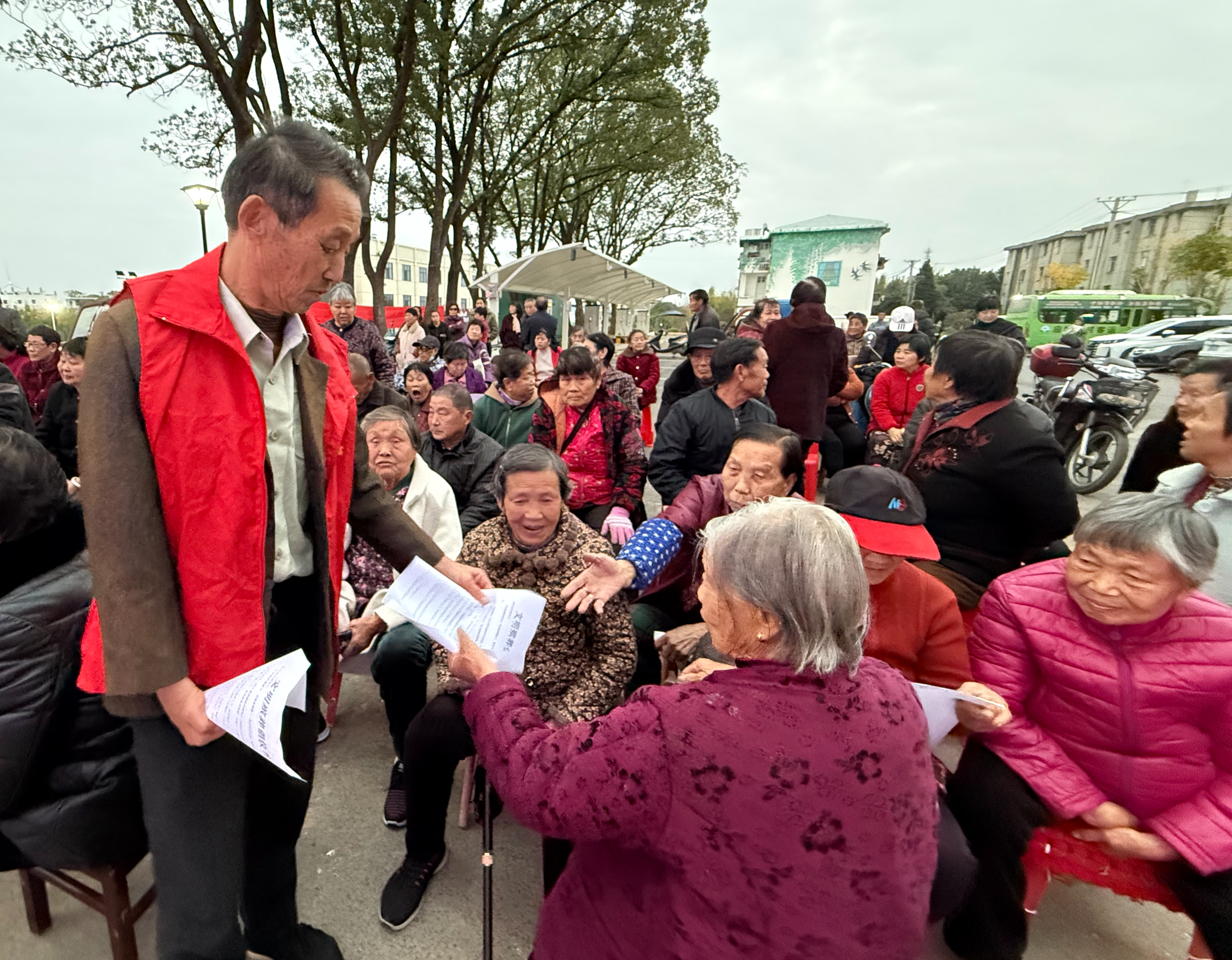11月12日,在熙熙攘攘的人群中,一群身穿红衣的志愿者正在来往的群众发放移风易俗宣传单。