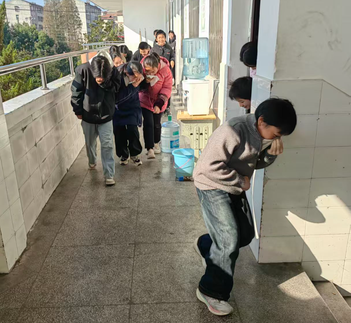 演练警报声响起,各班级老师迅速反应,组织学生进行疏散。同学们在老师指导下,用手绢或湿毛巾捂住口鼻,弯腰低姿,快速有序地向教室外撤离。他们动作迅速,有条不紊。此次演练从警报声响起到全体师生在运动场集合,整个过程用时2分零6秒,全校446名师生无一人掉队,全部到达安全指定位置。