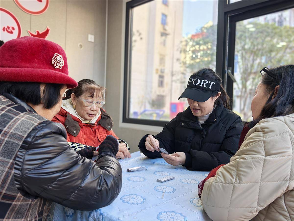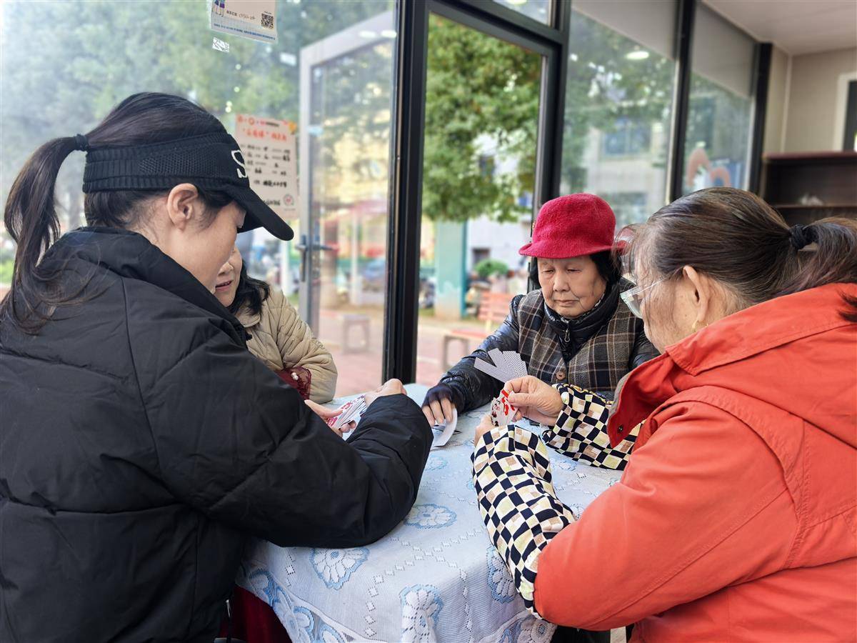 居民在月圆一村城市驿站打纸牌,他们自发搬来椅子,轮流打扫卫生,十分爱护驿站环境。(湖北日报全媒记者 方桐 摄)