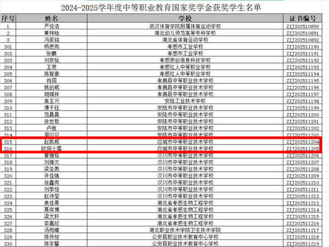 近日,教育部、人力资源社会保障部发布《关于2024-2025学年度中等职业教育国家奖学金获奖学生名单的公告》,应城市两名优秀中职学生上榜。此次全国共19992名学生获奖,每人奖励6000元。