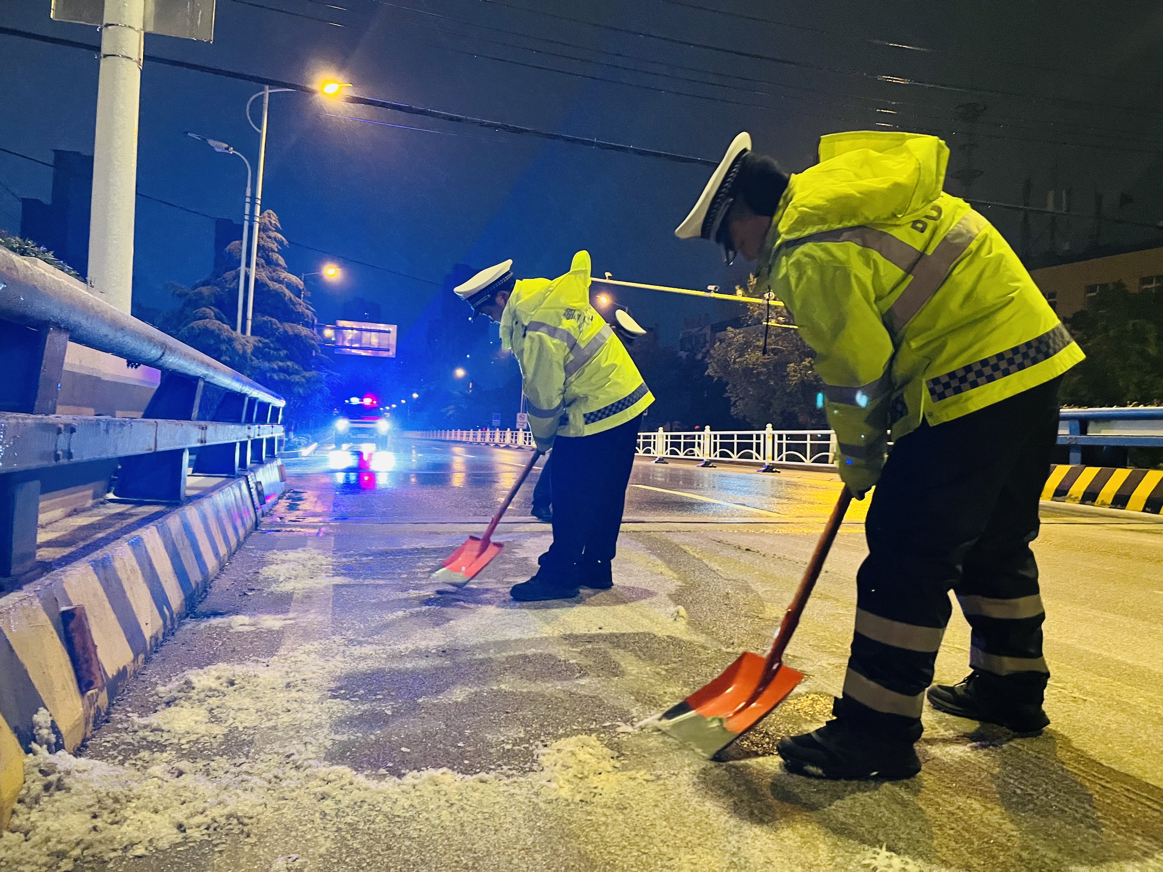 应城市公安局交警大队以雪为令、闻令而动,迅速启动恶劣天气应急预案,构建“定点警示+流动巡逻+动态喊话”三维管控体系。在应城一桥、二桥、杨河大桥等易结冰桥梁及重点路段设立固定警示岗,摆放反光锥桶、警示标志,安排民辅警冒雪值守疏导;沿城区主干道及G347、s210、s212重点线路开展高频次巡逻,加密人员密集区域管控,启用车载喇叭循环喊话,提醒驾驶员“减速慢行、保持车距”。