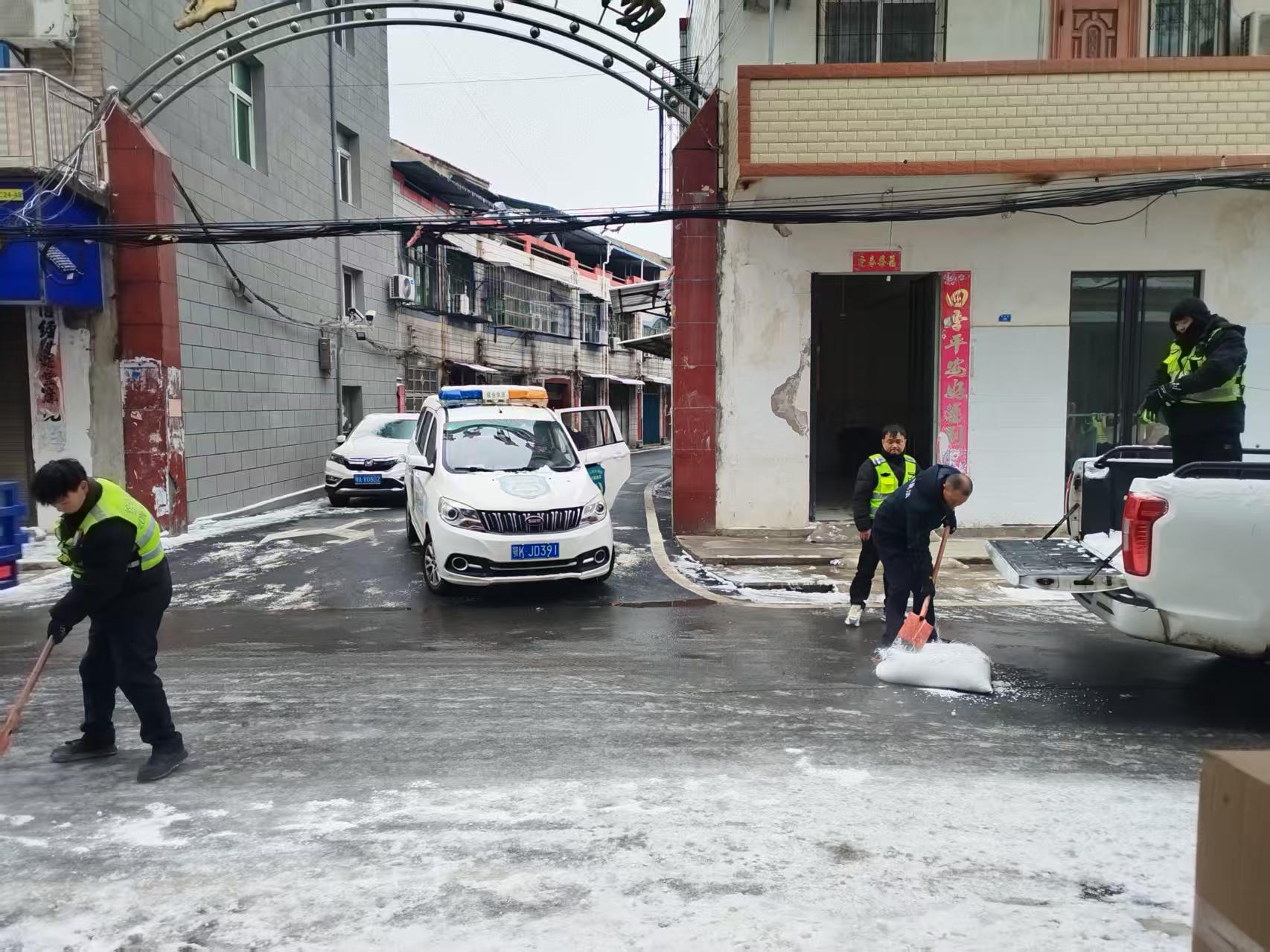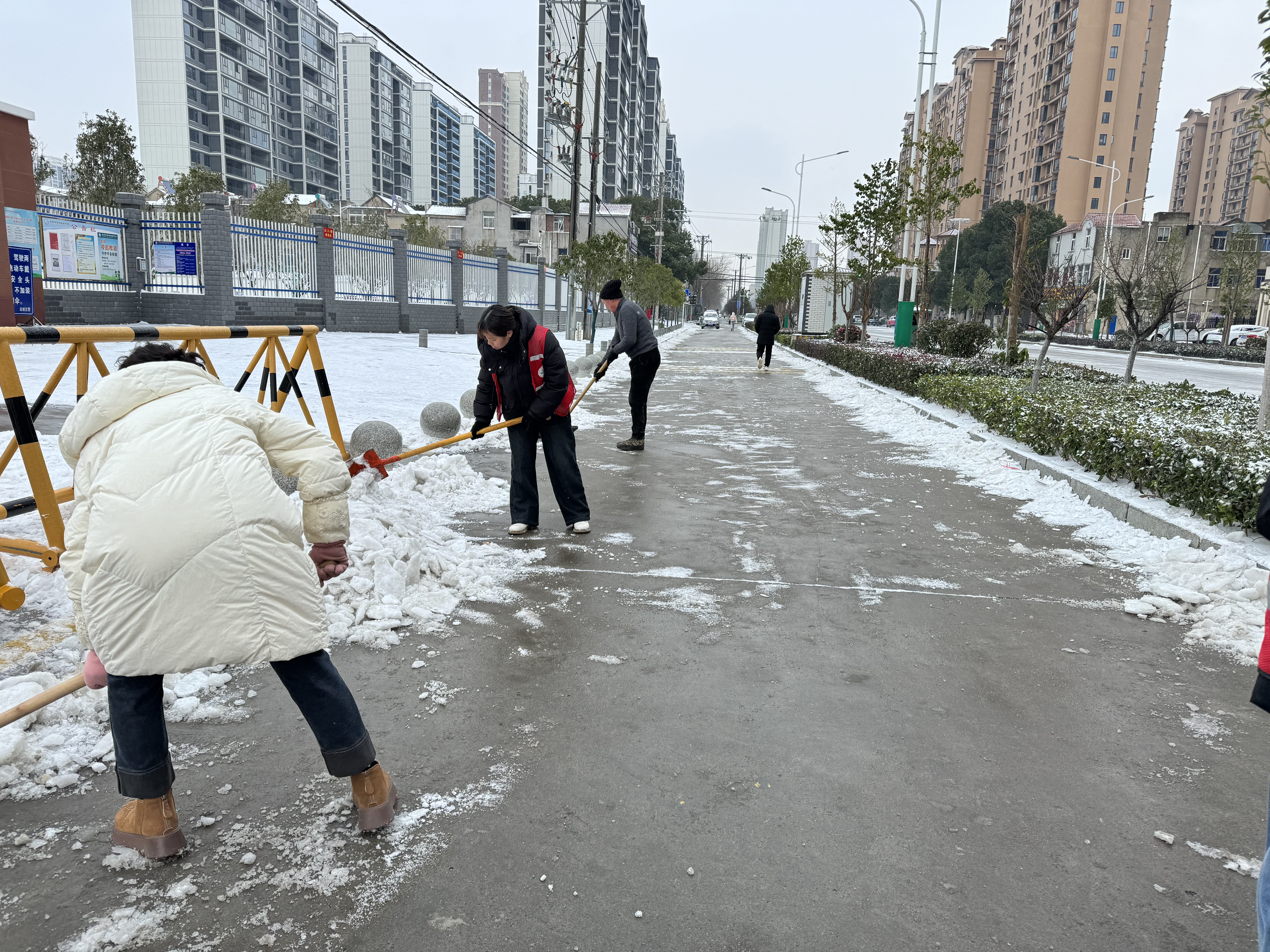 大家带着铁锹、扫帚等工具,到辖区主干道等重点区域,清扫路面积雪。对易结冰路段科学撒布融雪盐,加速积雪融化;并在关键点位引导过往车辆、行人减速慢行,提醒做好防滑措施。