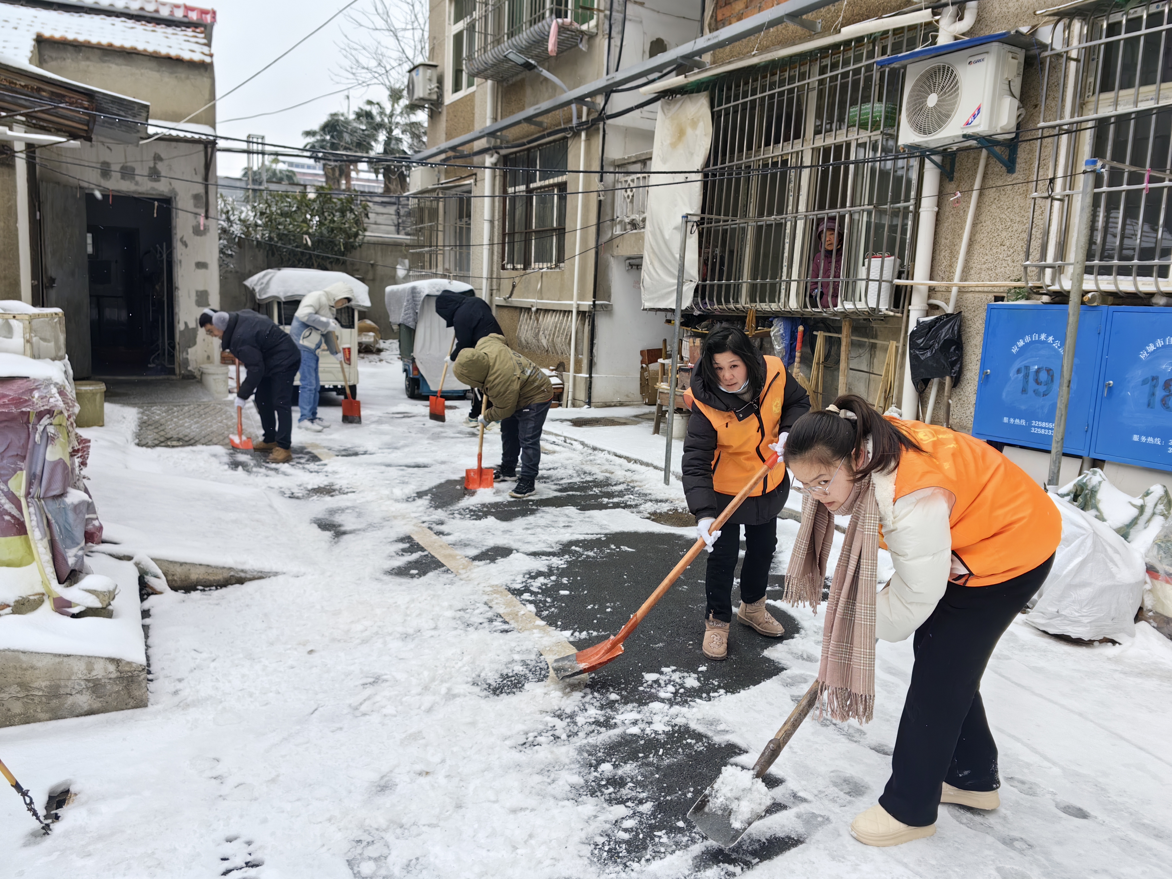 该镇50余名机关干部、党员及志愿者闻令即行,迅速下沉街道社区,投身“清雪通路”志愿服务一线。