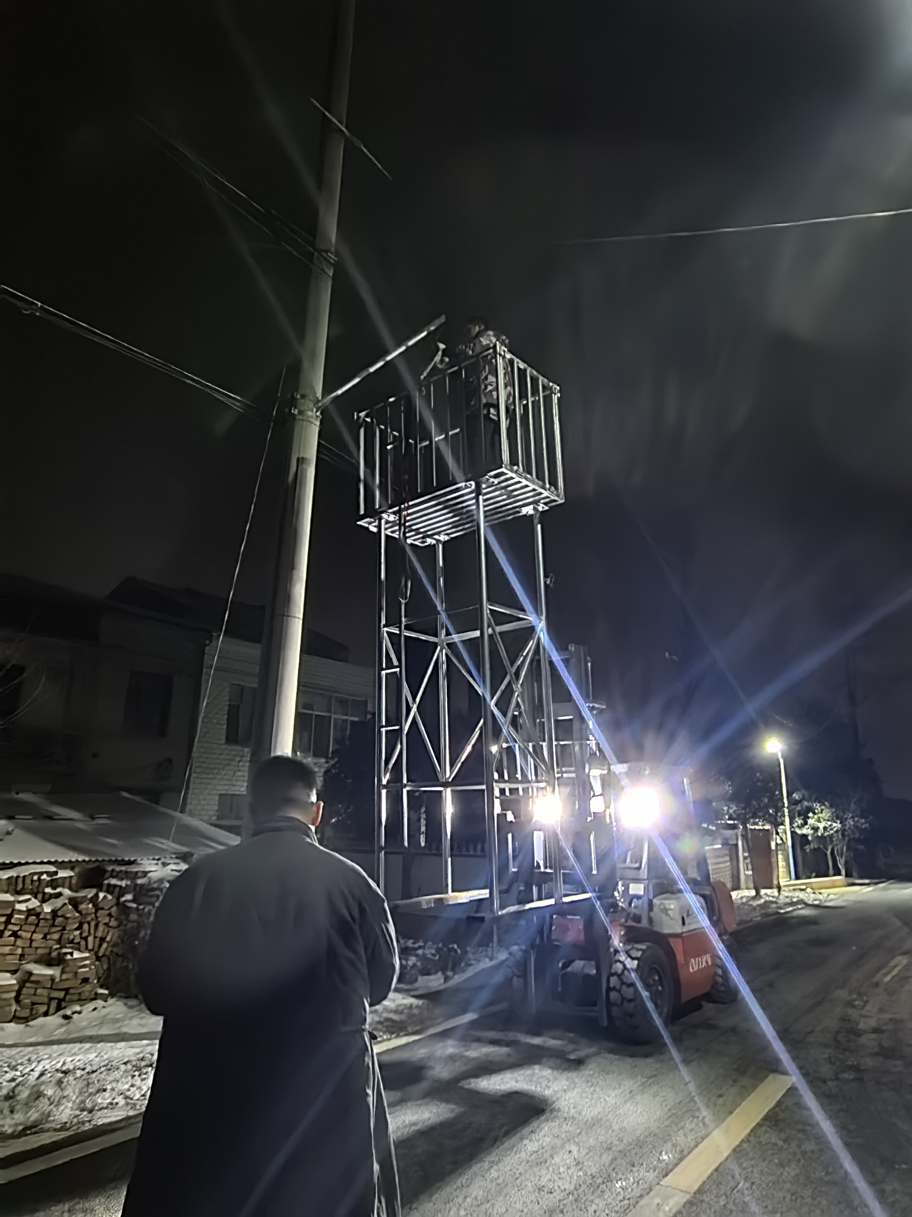 由于雨雪冰冻天气导致路面湿滑,路灯故障影响了行人安全出行。抢修人员连夜奔赴现场,克服夜间作业不便等困难,快速排查故障、检修线路、更换部件,高效完成全部抢修工作。