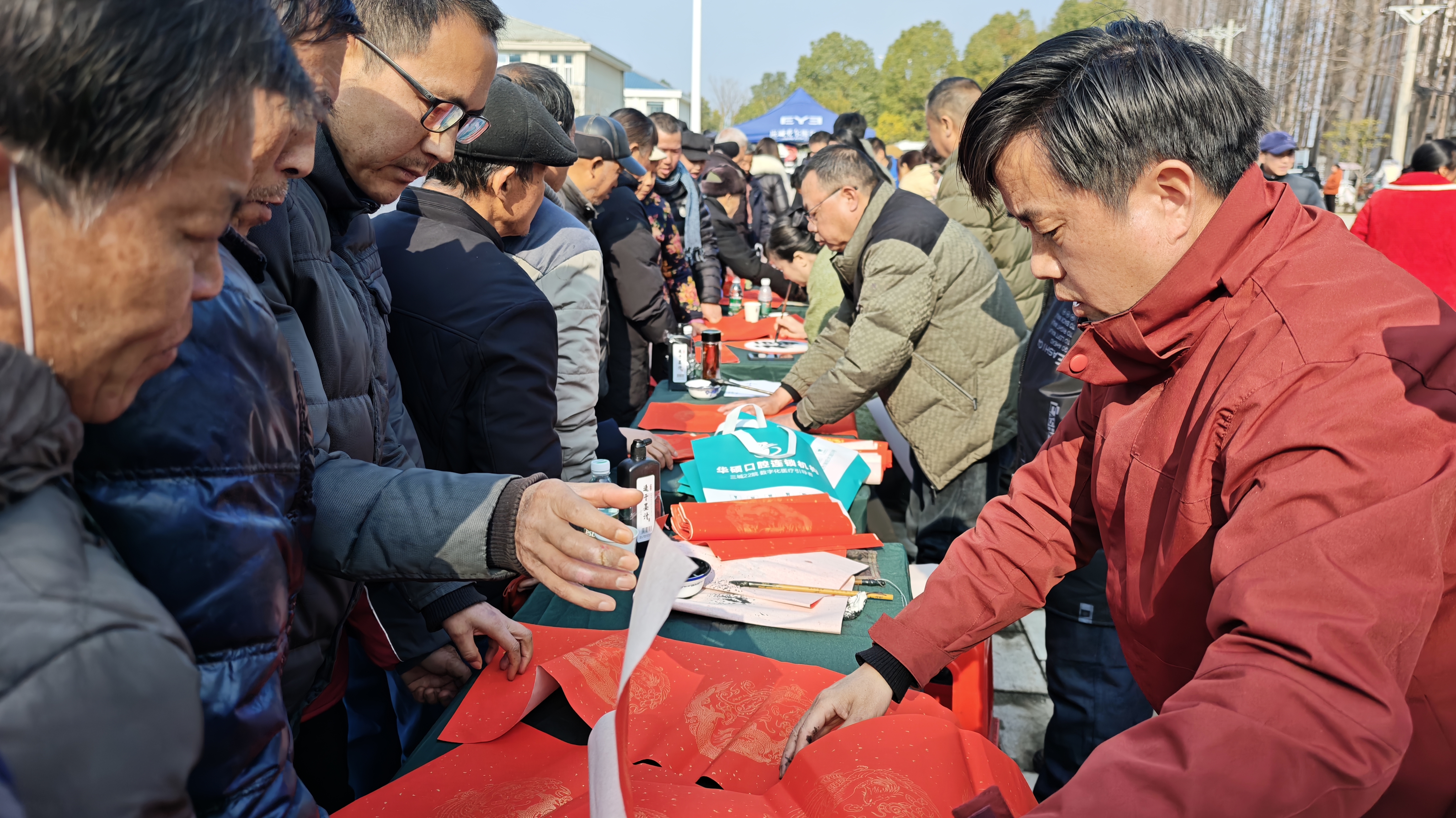 书法长桌上,红纸铺展如霞。书法家根据居民挑选的吉祥联句,笔走龙蛇。一副“花开盛世报春来,马踏祥云驮福至”的春联刚完成,就被等候多时的群众请走。墨香中,不同字体的祝福跃然纸上。