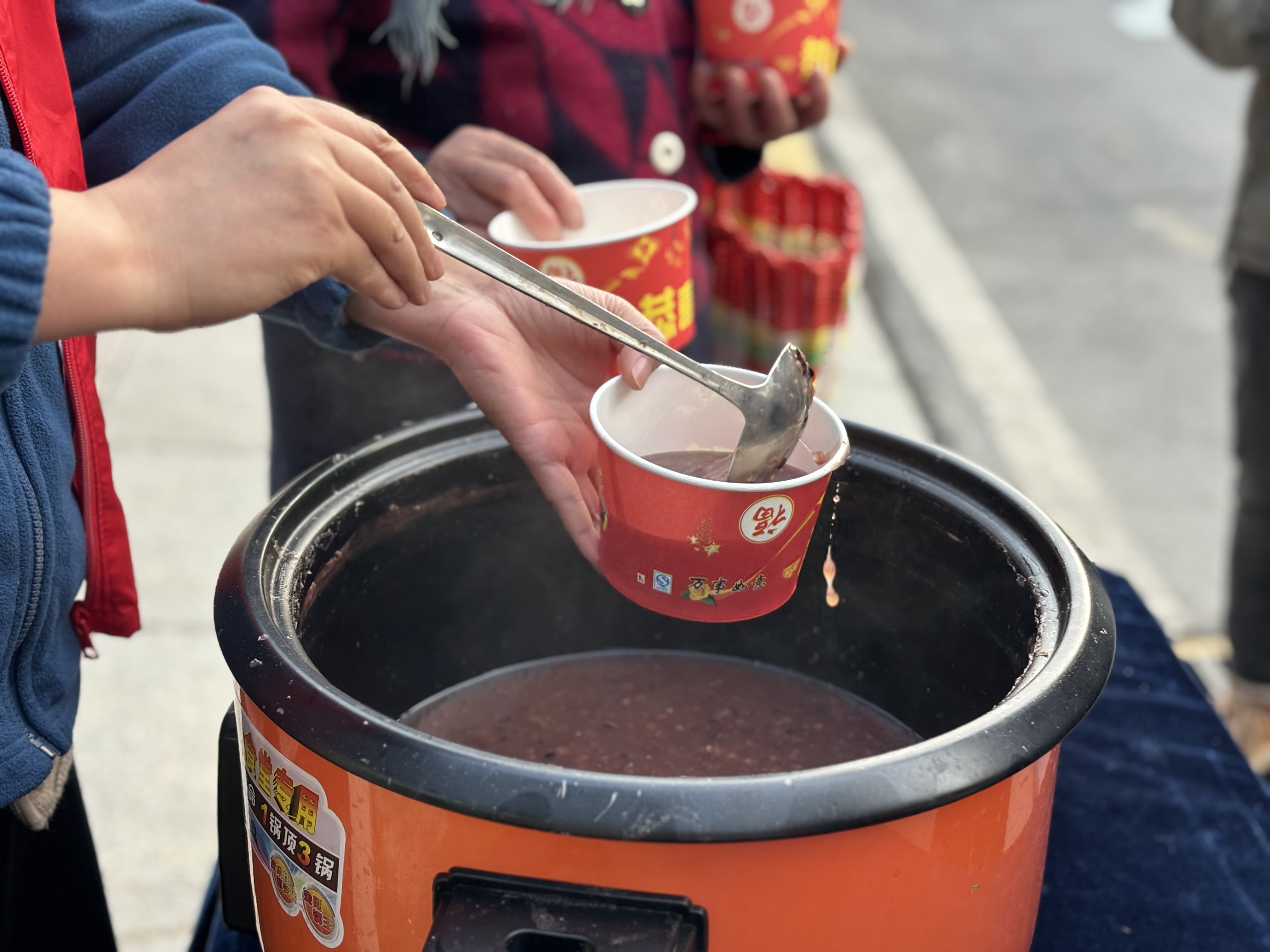 活动现场,志愿者有序为居民盛粥递碗,居民们排队领粥、闲话家常,热闹的氛围驱散了冬日寒意。