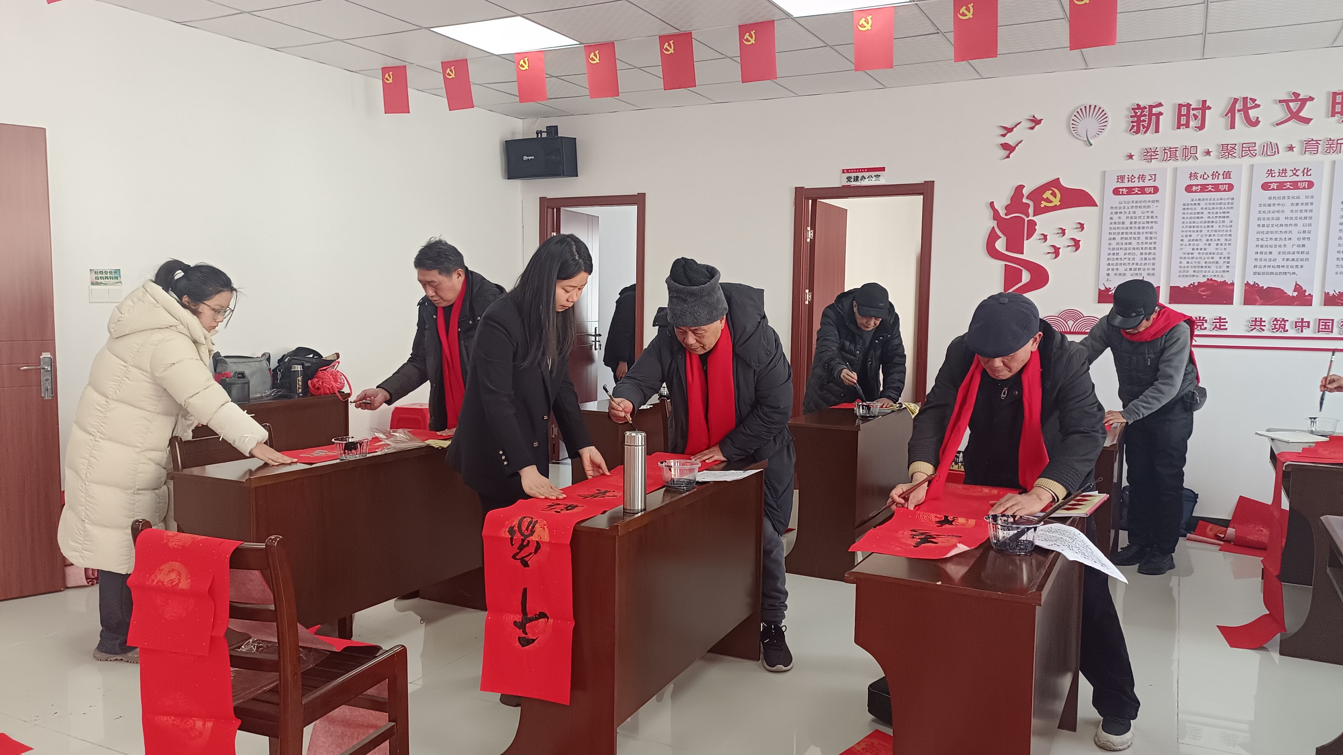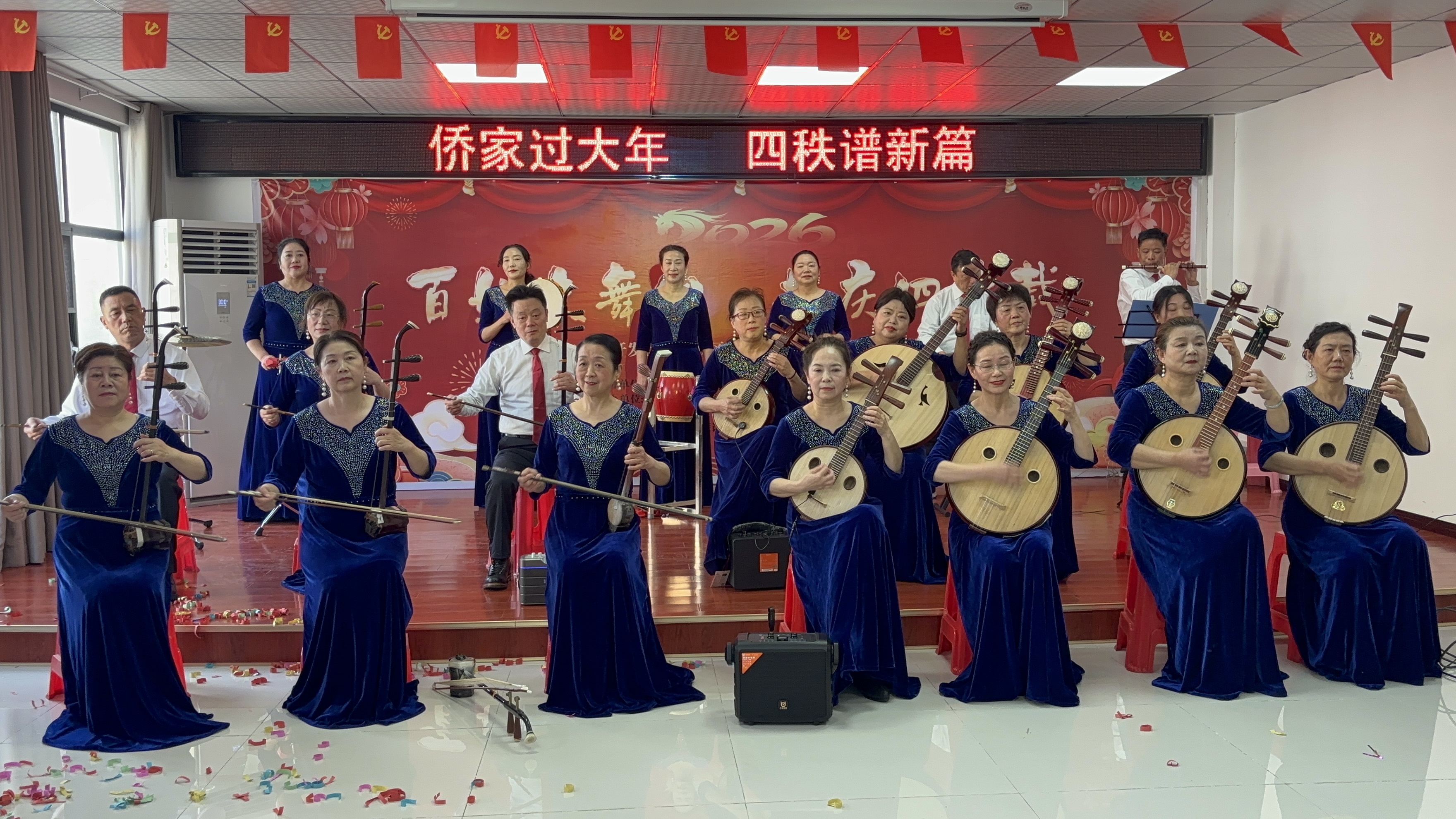 活动现场氛围热烈,侨胞侨眷登台展示乐器演奏、歌舞、朗诵等才艺,侨界书法爱好者现场挥毫泼墨,书写春联200余副、福字100余张赠送给社区群众。
