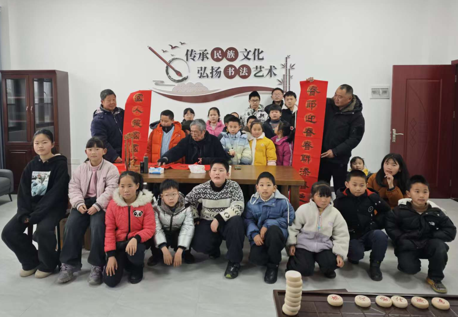 2月3日,应城市三合镇街道社区老年大学的书法爱好者们走进“爱心托管班”开展毛笔字教学活动。