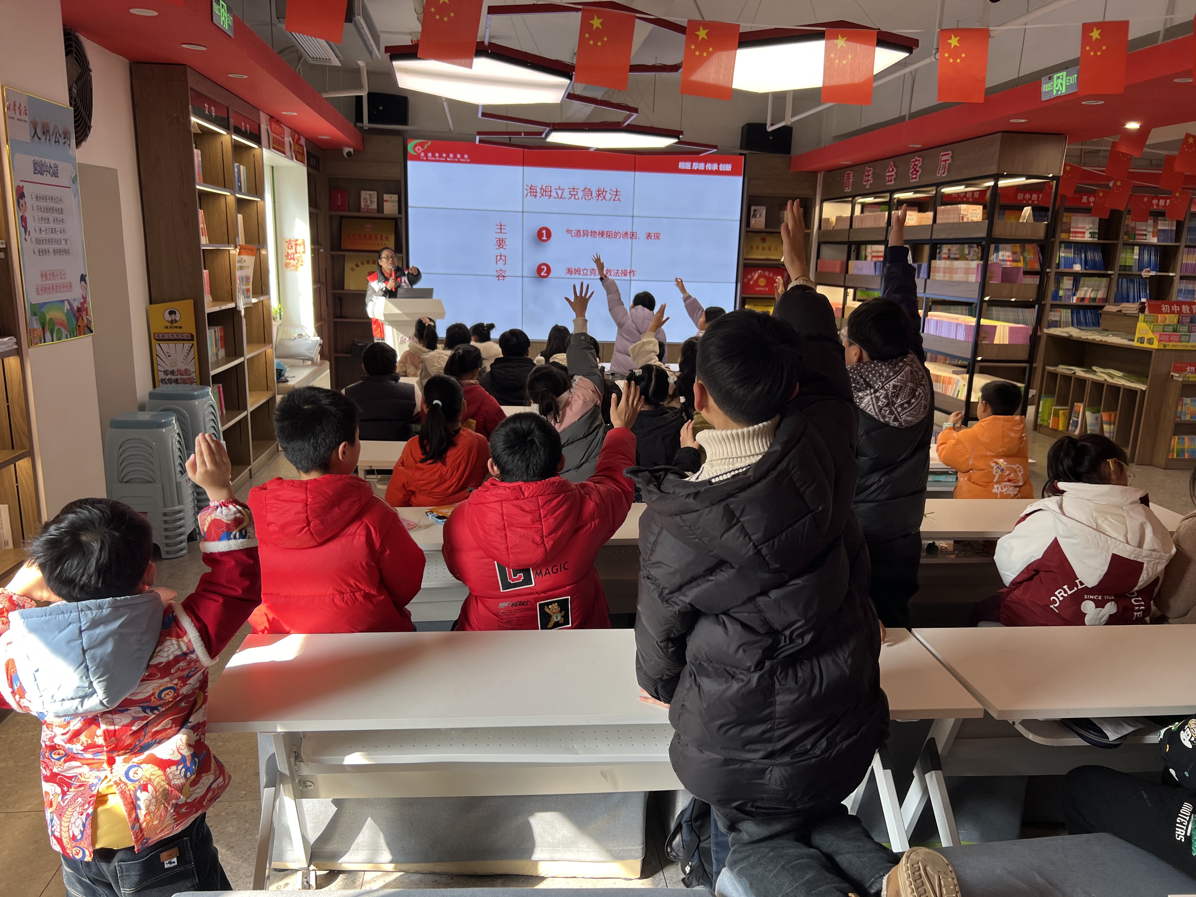 整个培训过程采用“理论讲解+现场演示+互动实操”的模式,新华书店阅读区变成了趣味安全课堂,孩子们积极举手提问、踊跃参与实操,现气氛热烈。