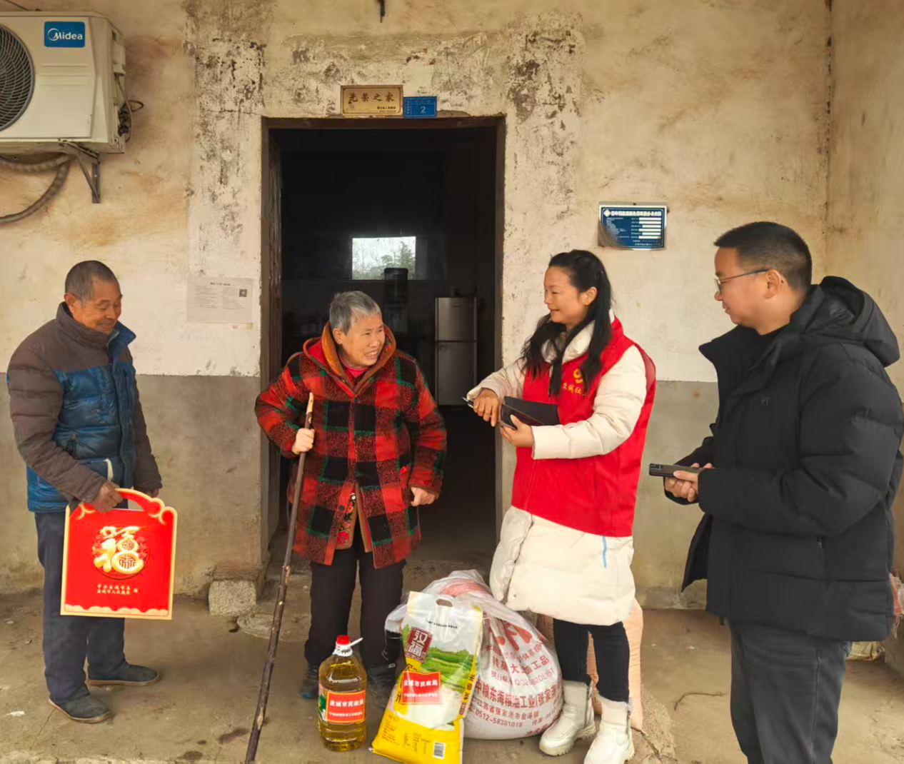 慰问小组走进每一户慰问对象家中,详细询问其生活状况、健康情况以及目前面临的困难,倾听他们的诉求和心声,为他们送上了大米、食用油等生活物资和新春对联、大红福字,提前向他们致以新春祝福。
