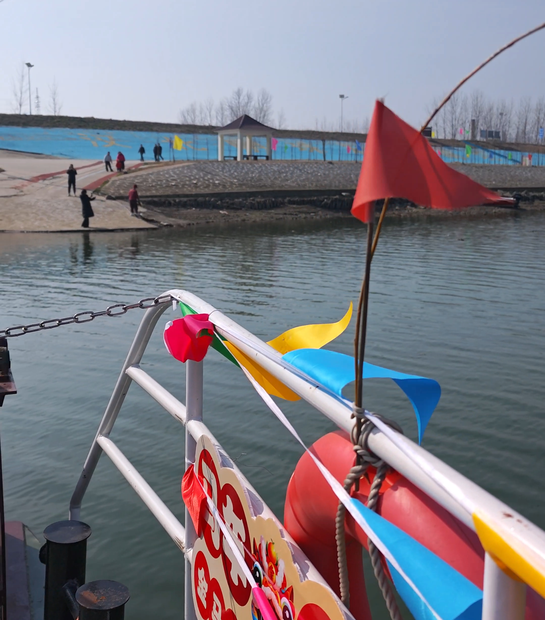 中午时分,活动在暖阳中正式开场。游客们相继登上免费渡船,沿汉北河徐徐而行。虽值二月寒时,河水却映着粼粼天光,沿岸草木疏朗,静谧中透出冬日特有的清新与开阔。这条黄金水道,不仅滋养一方水土,也成为今天人们走进湖乡的第一扇窗。