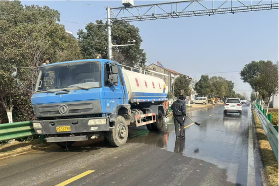 工作人员与志愿者对辖区主干道、村湾小路全面清扫除尘,重点清理路面垃圾、杂物与路边杂草。