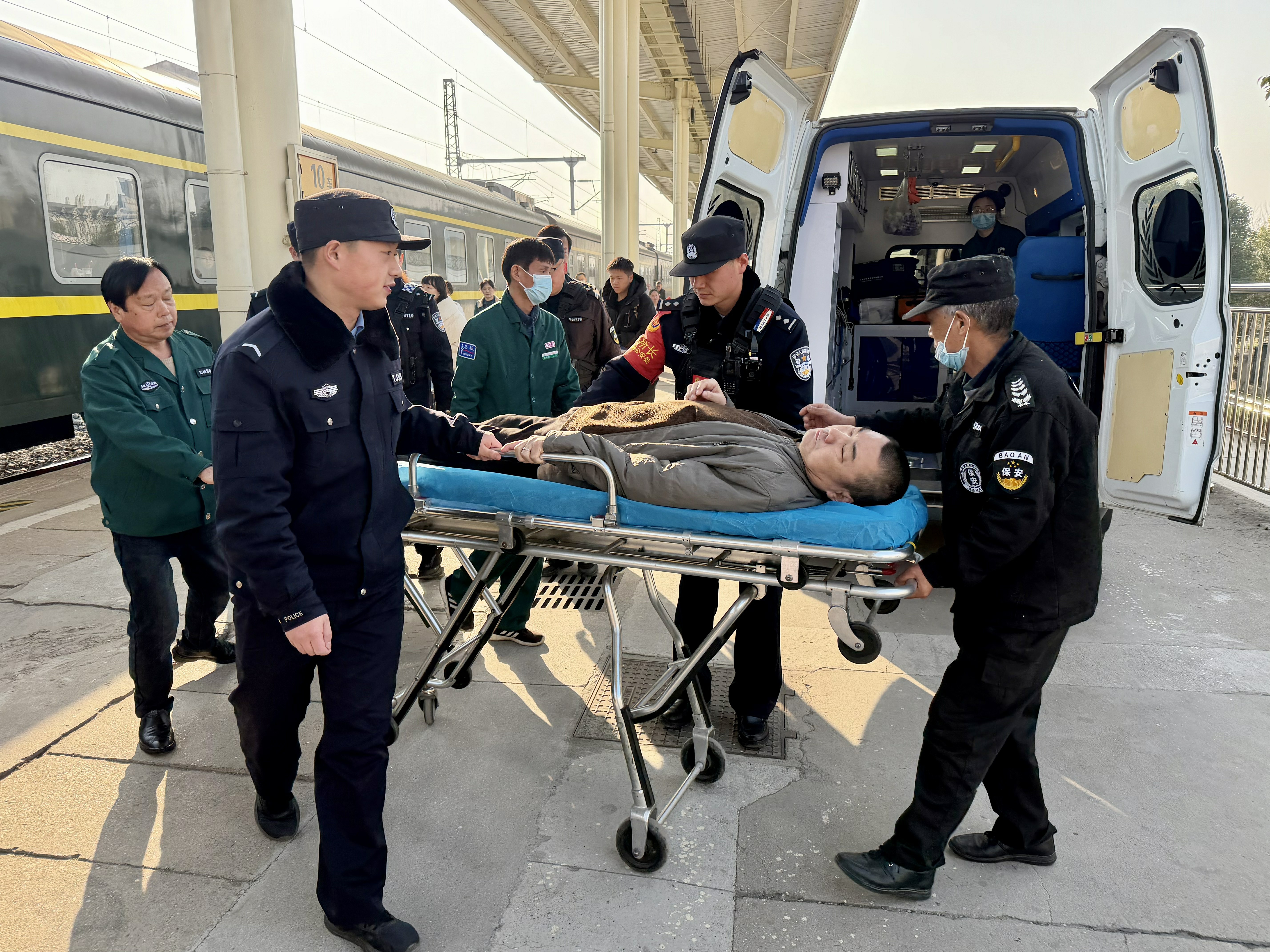 襄阳铁路公安处应城站派出所立即启动应急预案。副所长杨乐迅速带领民警洪旭紫阳、张承晗,以及学警杨巍、唐梓喜、应城市公安局驻站特警提前在站台集结待命,协调急救力量赶赴车站,并在站台开辟出一条绿色通道。K5434次列车停靠应城站后,早已等候在站台的民辅警迅速行动,与列车工作人员、急救人员默契配合完成病情交接、旅客转运等一系列工作。杨先生被一路畅通无阻地送上救护车。